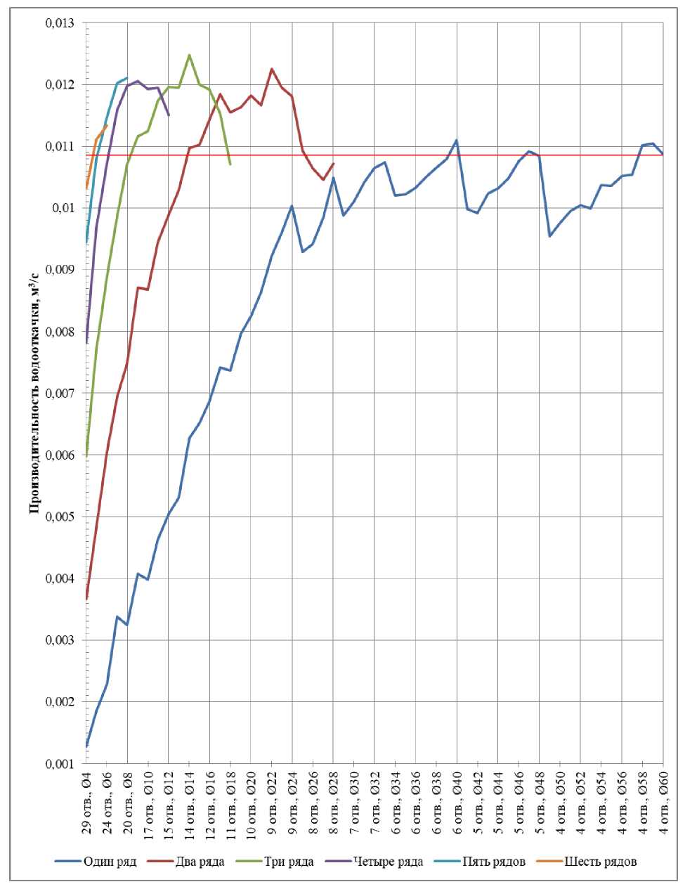 Как следует из рис. 3, наилучшее расположение ряда отверстий – область окончания сужения диаметра напорного патрубка, соответствующая его средней части. После определения наилучшего варианта расположения ряда, исходя из обеспечения условий прочности и технологичности, было выполнено большое число симуляционных расчетов в диапазоне диаметров отверстий от 4 до 60 мм и их числа от 29 до 4 соответственно. Лишь в 5 случаях моделирования из 57 удалось обеспечить требуемую производительность системы водооткачки, поэтому были выполнены оценочные расчеты c большим числом рядов. Полученные результаты подтвердили необходимость рассмотрения большего числа рядов для обеспечения максимальной производительности системы водооткачки. На рис. 4 представлены результаты симуляционных расчетов для всего рассматриваемого диапазона диаметров и отверстий при числе рядов от 1 до 6.