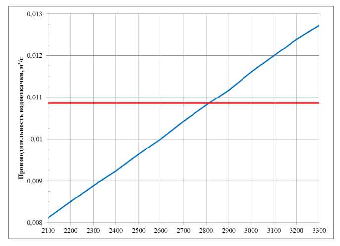 Как и в предыдущем случае, для повышения наглядности на данном графике демонстрируется изменение производительности водооткачки. Наилучший эффект достигается при диаметре входного отверстия 10 мм и выходного 14 мм. Необходимо отметить, что в рамках работы рассматривались не только круглые, но и прямоугольные отверстия. При таком подходе в напорном патрубке после направляющего аппарата был удален весь материал сектора водооткачки – образовано окно, в дальнейшем туда последовательно вводились продольные и поперечные ребра, вплоть до величины сторон отверстий – не более 5 мм, но такая конструкция несоизмеримо более сложна в изготовлении, а полученный расход не превышал 0,012 м3/с. Также, помимо работ, связанных с определением расположения и конструктивных параметров отверстий в выходном напорном патрубке, в рамках исследования была проведена серия расчетов и достигнуто снижение сопротивления трассы всасывания системы водооткачки в 1,97 раз. Характеристика доработанной эжекционной системы водооткачки приведена на рис. 7. Красная горизонтальная линия – требуемый уровень производительности водооткачки. Совокупность принятых решений позволила обеспечить требуемый уровень производительности эжекционной системы водооткачки при частоте вращения вала водометного движителя более 2812 об/мин. В исходной конструкции при максимальной частоте вращения вала водометного движителя производительность эжекционной системы водооткачки составляла 0,009674 м3/с – требуемый уровень не обеспечивался.