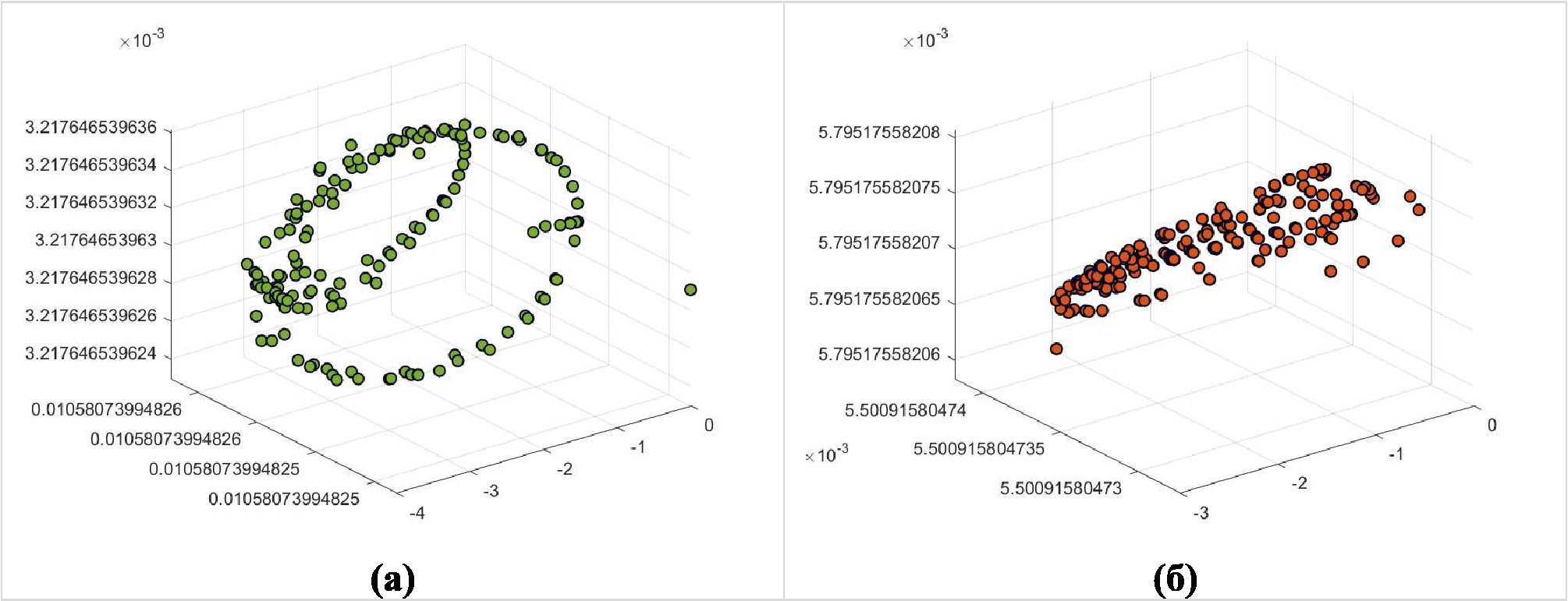 Рис. 5. АКФ нормального напряжения (а) и АКФ при падении напряжения (б) в трехмерном пространстве