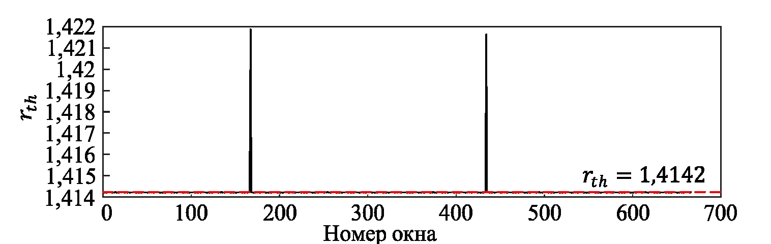 Как видим, в трехмерном пространстве существует четкое разделение между АКФ, когда провал напряжения сопровождается шумом и гармониками, и АКФ нормального сигнала напряжения. Результаты обнаружения автокодировщика показаны на рис. 10. Временами начала и окончания обнаруженного провала напряжения являются 167-е и 434-е окна, т.е. 501-я и 1302-я точки выборки.