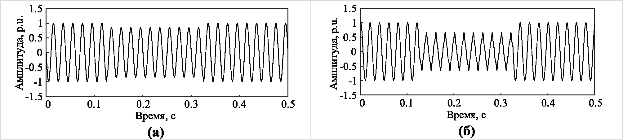 Рис. 7. Сигнал с наложенным белым шумом с отношением сигнал/шум 60 (а) и сигнал, содержащий 3-ю и 5-ю гармоники (б)