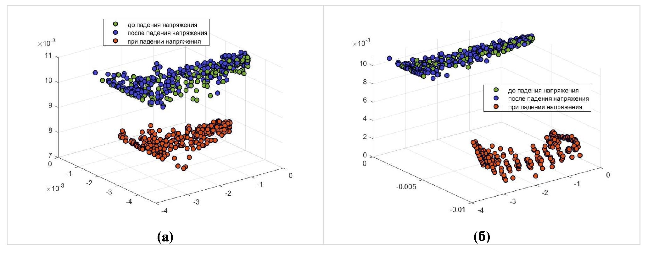Далее предлагаемый метод используется для обнаружения аномалий в сигнале напряжения. АКФ рассчитывается при длине окна d=3. АКФ нормального напряжения и напряжения при падении показана на рис. 5 в трехмерном пространстве.