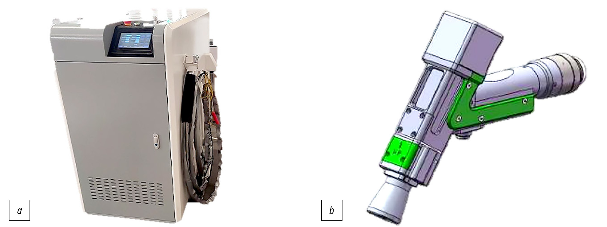 Для лазерной очистки экспериментальных образцов применялся аппарат Raptor SFW-3000 (рис. 2, а) — комплекс для лазерной чистки, резки и сварки с лазерной головкой RELFAR FWH20-S10A (рис. 2, b).