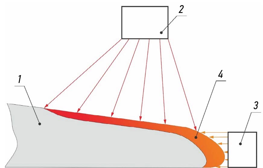 Рис. 3. 1 — обрабатываемый плоский образец; 2 — лазерный источник нагрева; 3 — индукционный источник нагрева; 4 — зона совместного действия двух источников нагрева.