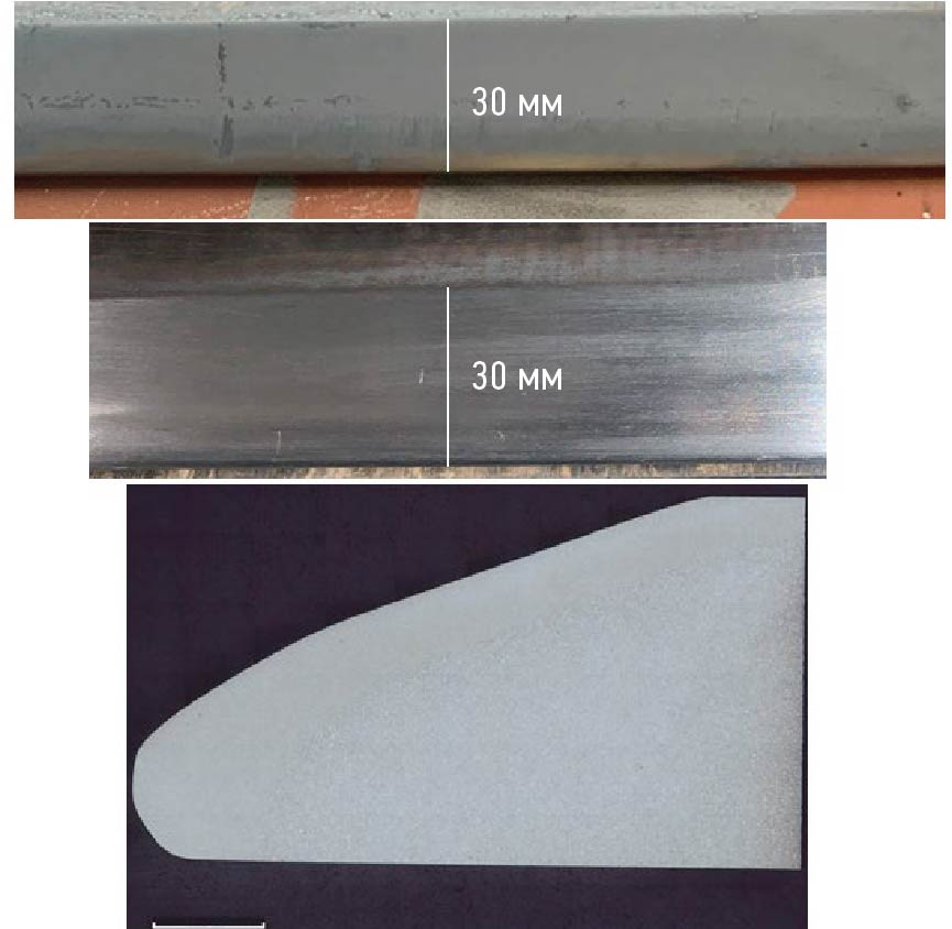 Рис. 7. Внешний вид упрочненной зоны поверхности переменного сечения образца 15Х11МФ: верх — после закалки; середина — после механической зачистки абразивной бумагой; низ — макрошлифы упрочненной зоны входной кромки.