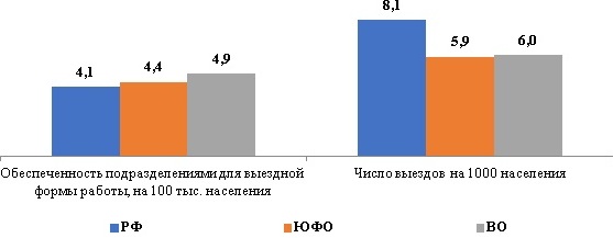 Рис. 1. Диаграмма обеспеченности населения подразделениями для выездной формы работы (на 100 тыс. населения, число выездов на 1 тыс. населения)