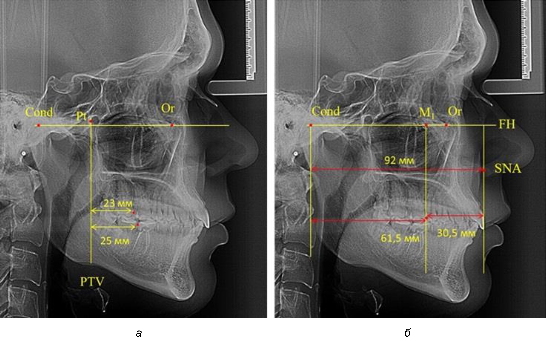 Так, при расстоянии от крыловидной вертикальной плоскости PTV до дистальной поверхности верхнего первого постоянного моляра в 13 мм сагиттальный размер гнатического отдела был 82 мм. При этом отношение кондилярно-спинального расстояния к кондилярно-молярному размеру (54,5) было близким к коэффициенту 1,5, что представлено на рис. 2.