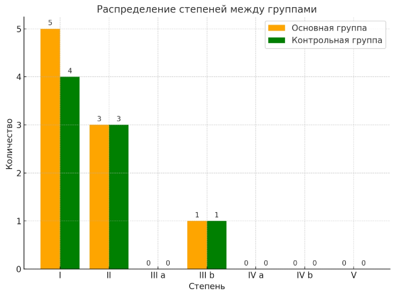 В контрольной группе осложнения I степени наблюдались у 10 % пациентов (4 из 40), II степени – у 7,5 % (3 из 40). У 2,5 % пациентов (1 из 40) были зарегистрированы осложнения IIIb степени (ревизионная операция) (рис. 3).