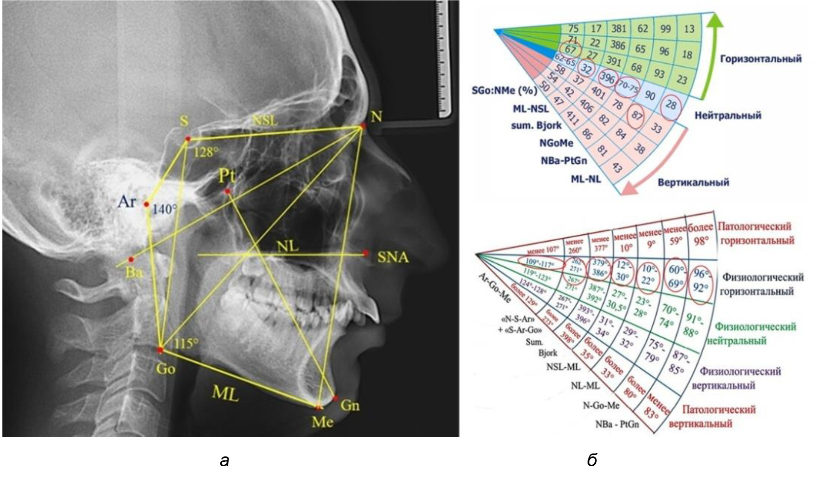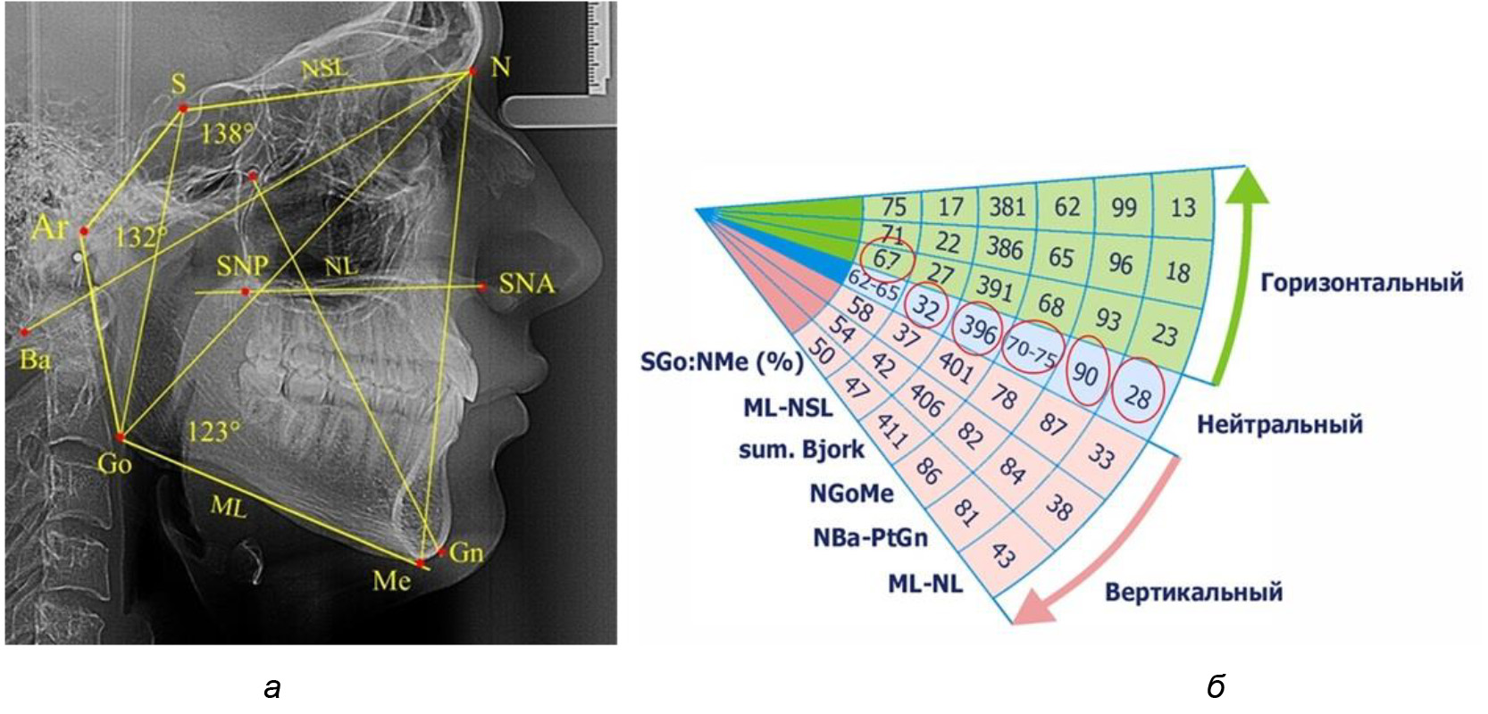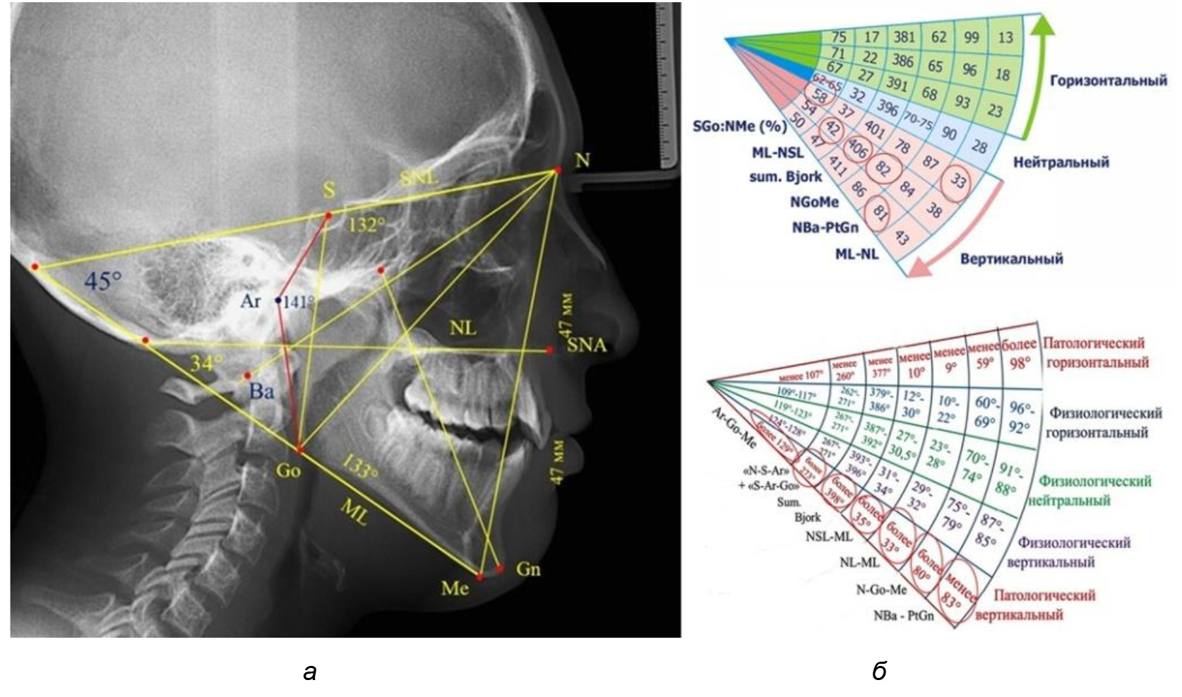 Рис. 1. Методы определения типов роста лица по угловым параметрам телерентгенограмм (а) и секторной диаграмме (б)