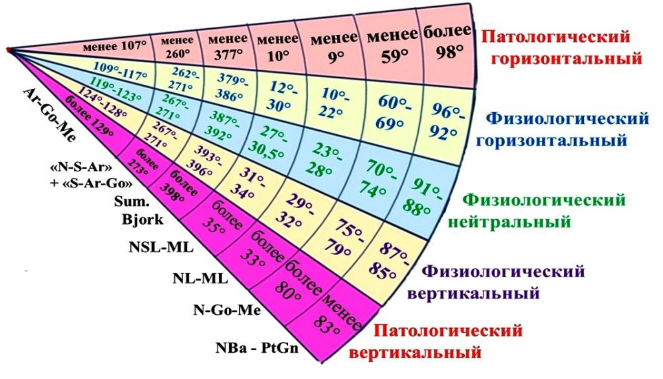 The analysis of the angular parameters of telerentgenograms aimed at determining the typological variants o the facial region of the head is still relevant and requires additions and improvements. Goal. To conduct a comparative analysis of various methods for determining the types of facial growth, including author's additions, in the physiology and pathology of occlusion on a telerentgenogram in lateral projection. Materials and methods. The retrospective study included the analysis of 46 telerentgenograms with physiological occlusion and 23 images with dental-alveolar and gnatic malocclusion. Traditional research methods were used in the analysis. The parameters of the total Bjork angle, the Ricketts facial angle, the lower gonial angle, and the angles determining the position of the mandibular plane to the base of the skull and the base of the upper jaw were determined. The analysis used a generally accepted sectoral chart of the types of facial head growth. Results and discussion. The total Bjork angle was (389.47 ± 1.46)°. The lower gonial angle was (71.26 ± 1.39)°. The facial angle of Ricketts in the whole group was (90.69 ± 0.72)°. The angle NSL-ML was (29.13 ± 1.28) degrees, and the angle NL-ML was (24.41 ± 1.64)°. All parameters were close to the neutral type of growth, however, significant variability of signs was determined. It was noted that the variability of the Bjork angle was usually determined by the magnitude of the mandibular angle, which varied from 110 to 128° during physiological occlusion. The results of the study made it possible to amend the data of the sectoral analysis of facial growth types and conduct a comparative study with generally accepted indicators. Conclusion. An analytical review of methods for assessing the typological features of a face allowed us to modify the sector diagram, which amended the ranges of variability of features and highlighted indicators of physiological and pathological variants of the type of facial growth. The proposed diagram can be used by orthodontists and maxillofacial surgeons when planning the treatment of occlusion anomalies associated with changes in the vertical parameters of the face and its main divisions.