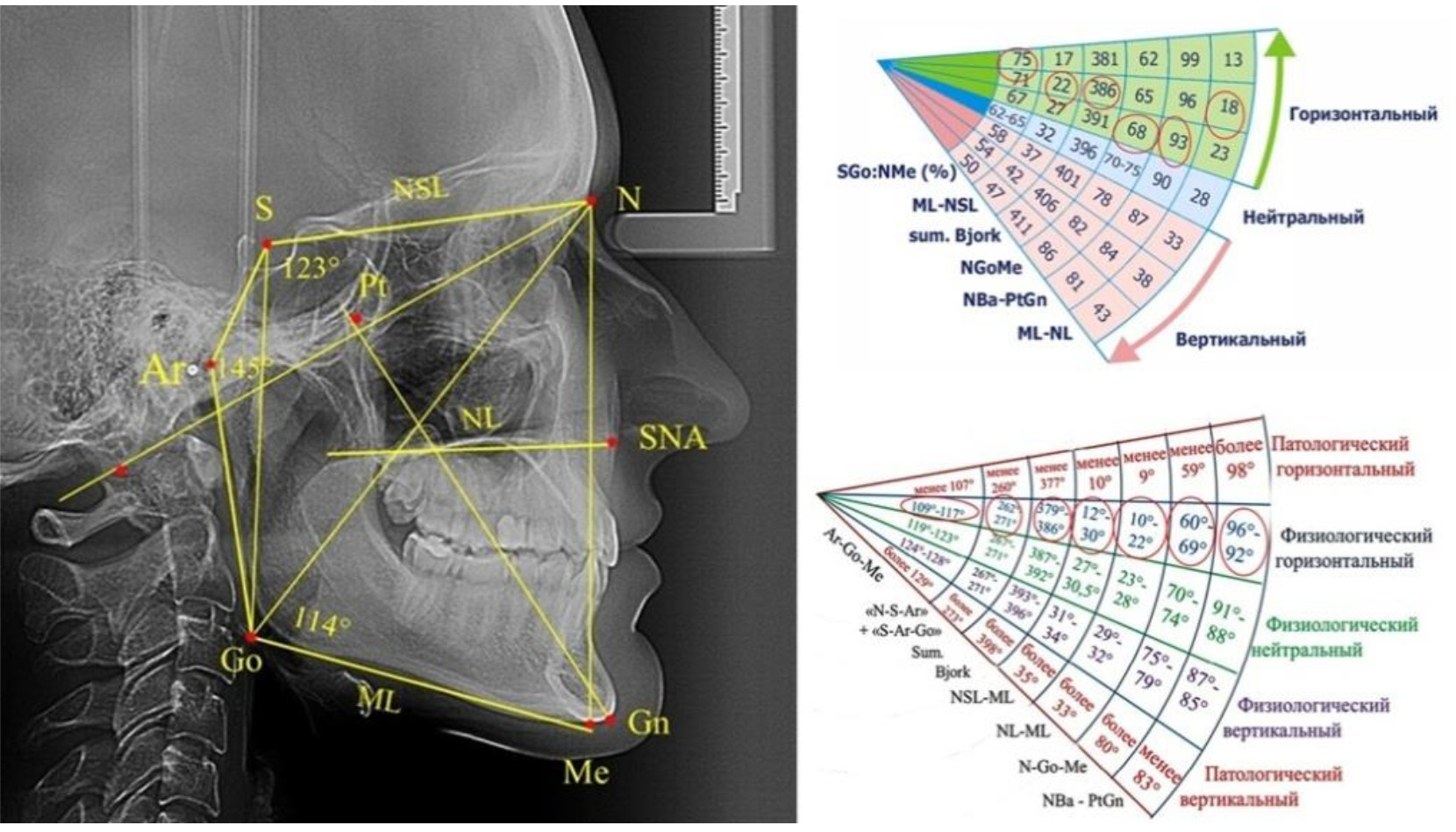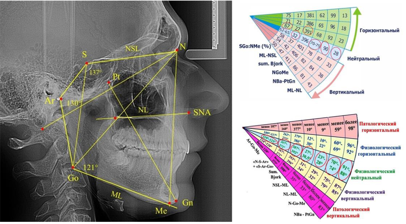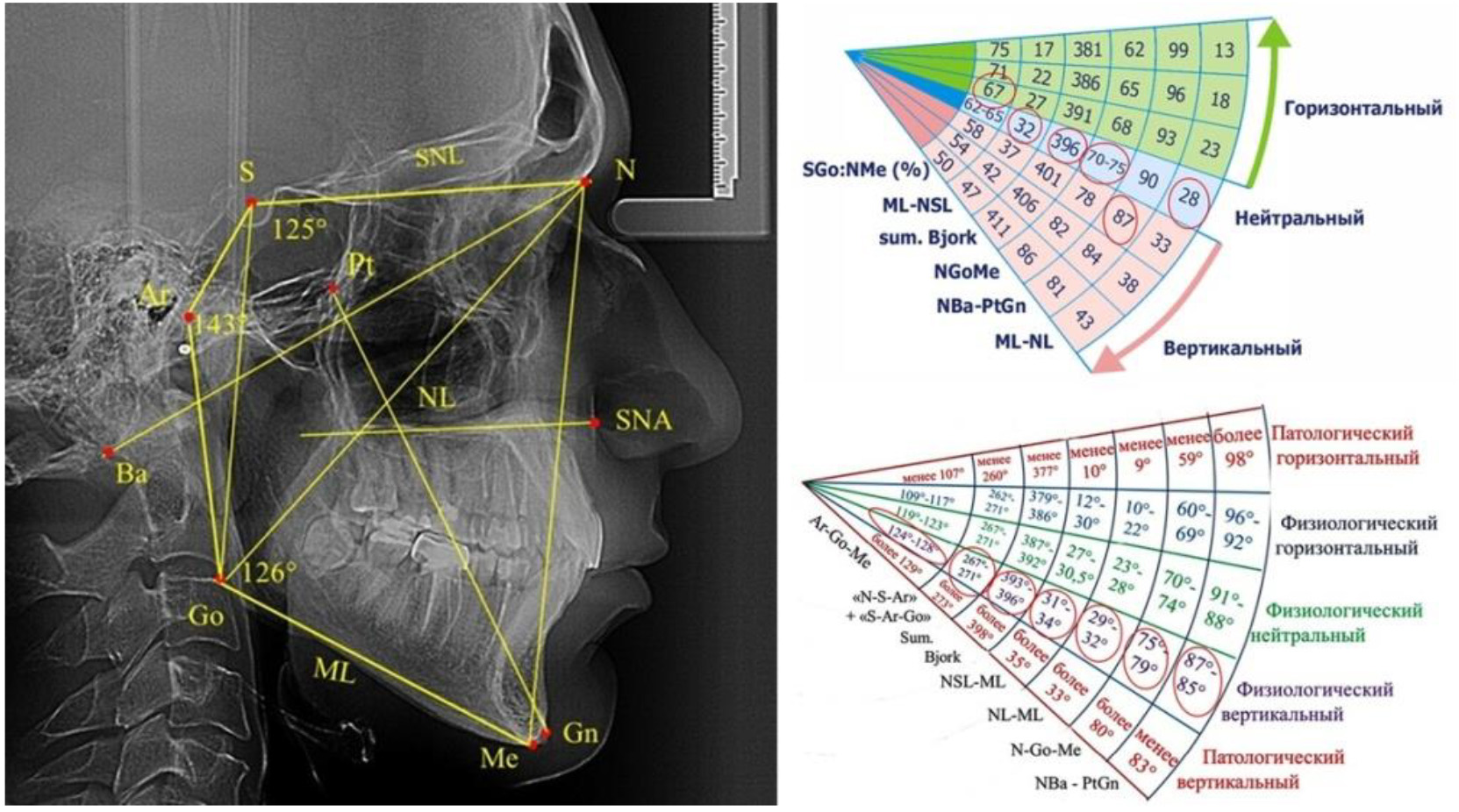 Традиционно в области соединения носовых костей с лобной ставили назальную точку N и соединяли со средней точкой турецкого седла S, что определяло положение линии основания черепа NSL. На задней выпуклости суставного отростка определяли положение артикулярной точки Ar, которую соединяли с точкой турецкого седла и получали угол N-S-Ar. В месте соединения касательных линий к ветви нижней челюсти и к телу получали конструктивную гониальную точка Go, которая позволяла оценить угол S-Ar-Go и угол Ar-Go-Me. При этом точка Ме определяла положение нижней точки подбородочного выступа. Суммарная составляющая параметров трех углов использовалась Bjork для определения типа роста лица и при нейтральном типе варьировала, по мнению автора, от 393 до 399°.