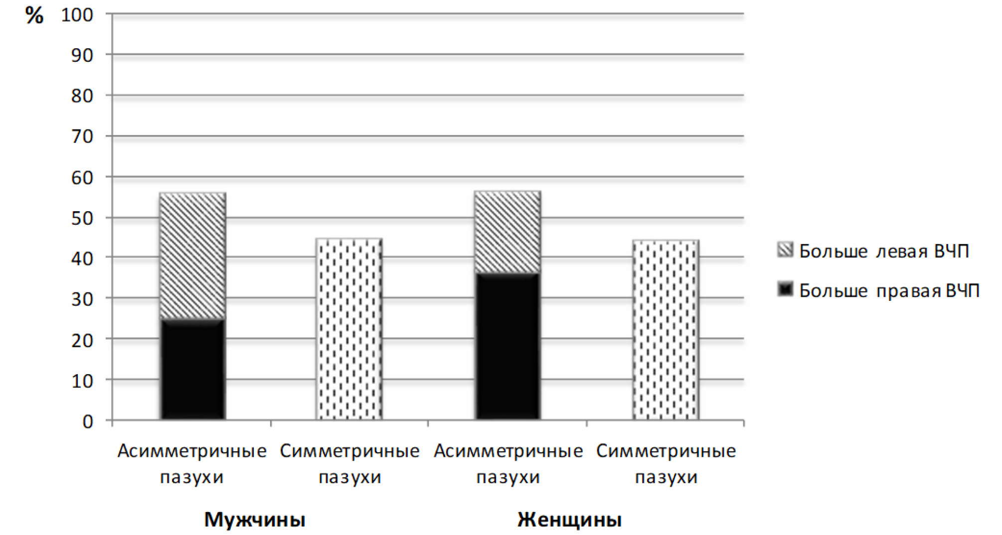 Анализ выборки показывает, что среди 36 объектов мужского пола с МФЛЧ 44,4 % черепов имеют симметричные синусы (рис. 1). Однако в 55,6 % случаев определяются черепа с асимметричными гайморовыми пазухами.