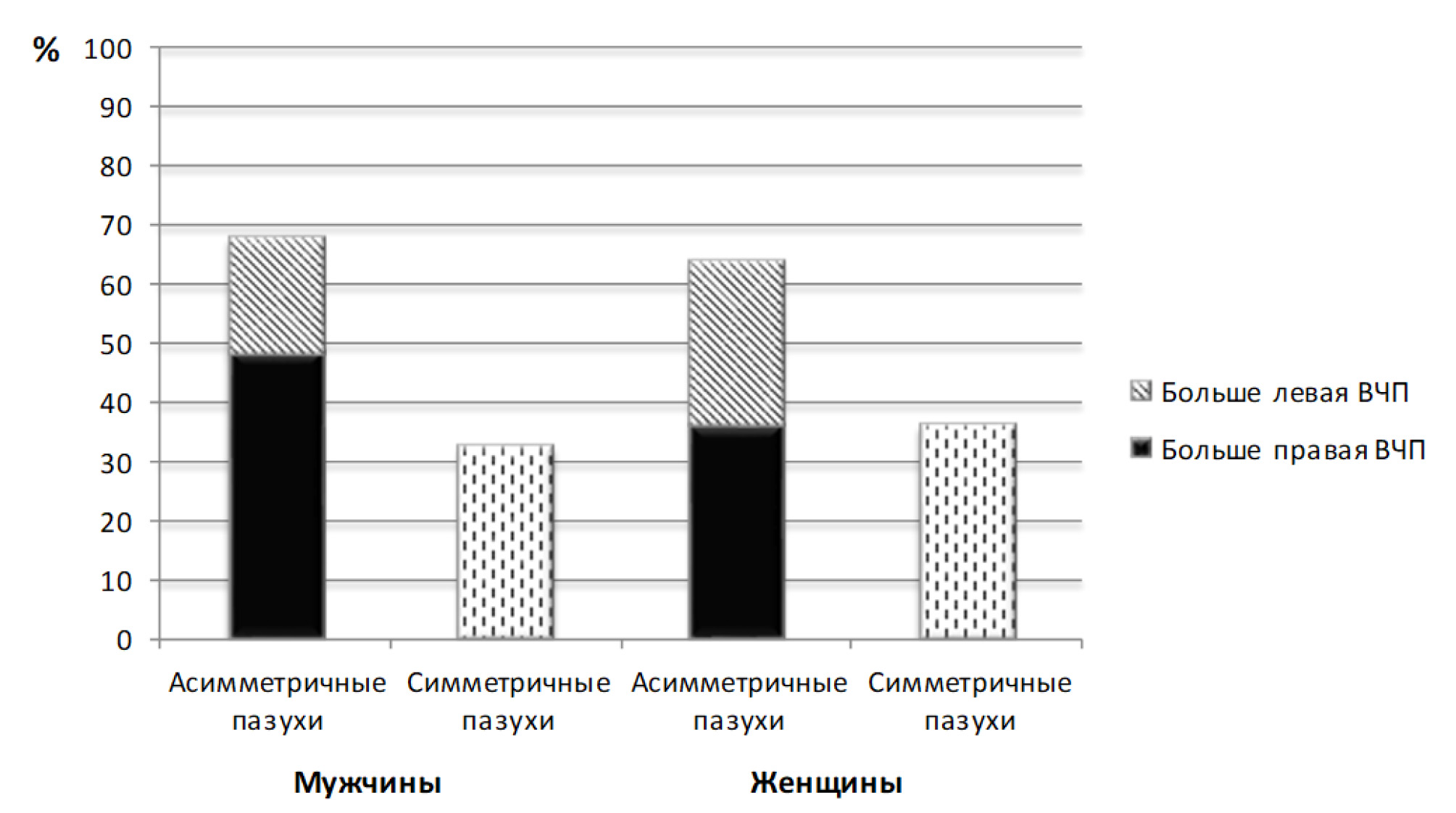 Рис. 2. Частота встречаемости объектов исследования с симметричными и асимметричными верхнечелюстными пазухами при ЭФЛЧ (ВЧП – верхнечелюстная пазуха)