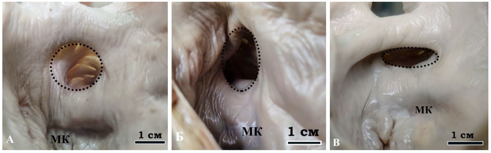В настоящем исследовании выявлено, что для устьев ЛУС в условно нормальном сердце характерна скорее овальная, нежели круглая форма. К таким же выводам пришли A.P. Stepanchuk и соавт. (2018) [9]. Исключительно овальная форма устья была выявлена при изучении как влажных, так и коррозионных препаратов [8, 12]. По другим данным, «форма отверстия ЛУС чаще щелевидная или овальная с большим вертикальным диаметром» [5, с. 68]. Мы не встречали устьев ЛУС, форму которых могли бы назвать щелевидной.