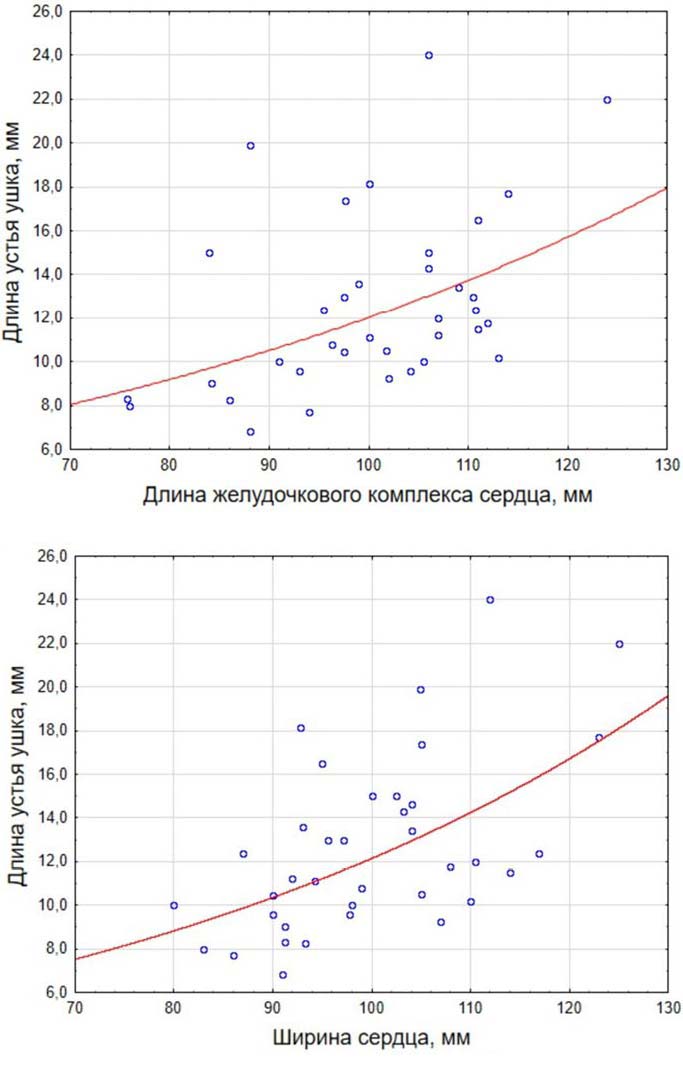 Из монографии Г.Н. Бородиной и соавт. (2012) известно о существовании коррелятивных связей между размерами сердца и его ушек. Доказано, что эти связи наиболее сильны в первом и втором периодах зрелого возраста [3]. В настоящем исследовании уточнено, что зависимость длины устья ЛУС от основных габаритных размеров сердца лучше всего описывается экспоненциальной функцией. Это значит, что даже небольшое увеличение длины и ширины желудочкового комплекса будет сопровождаться существенным увеличением устья ЛУС.