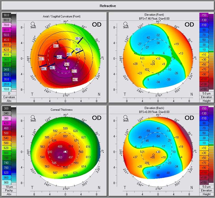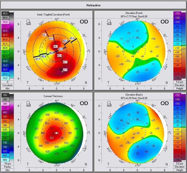 После проведённого нами комбинированного лечения также произошло снижение и рефрактометрических показателей. После имплантации интракорнеальных колец + корнеального кросслинкинга острота зрения повышалась в соответствии со стабилизацией рефракции, а после топографической фоторефрактивной кератэктомии удалось устранить остаточный рефракционный астигматизм и повысить остроту зрения до максимальных значений.
