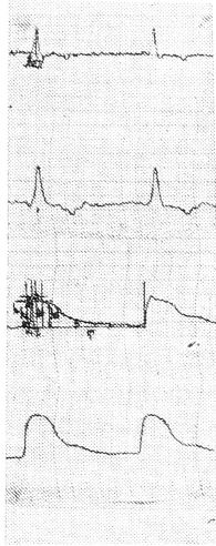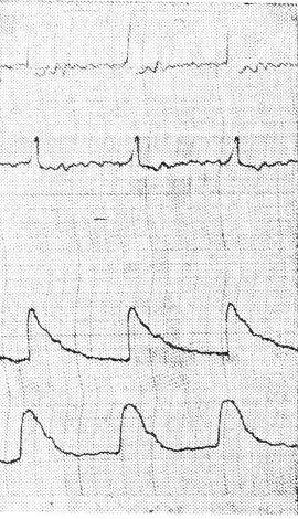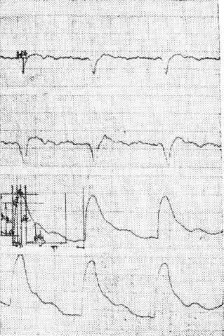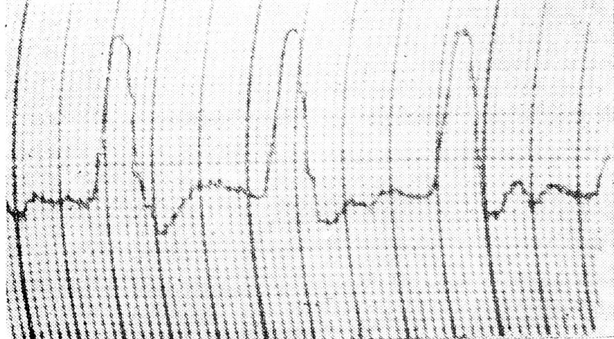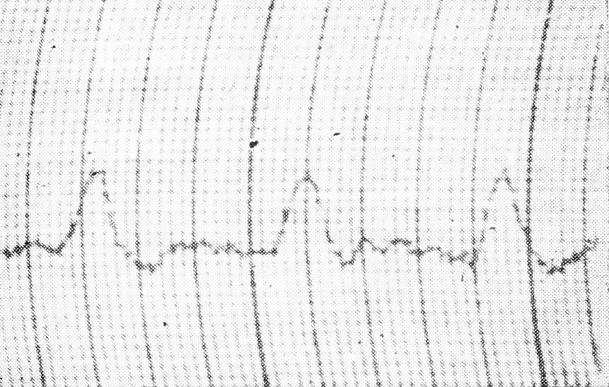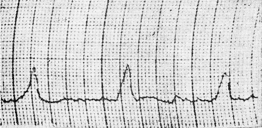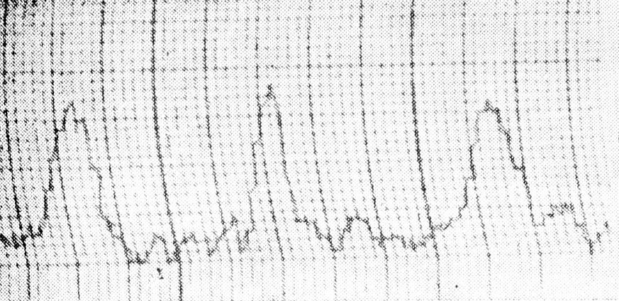 Показатели реограмм приведены в табл. 1. Географический систолический индекс (РИ), характеризующий пульсовые колебания кровенаполнения конечности, был достоверно снижен у больных ССР, причем сильнее на руках. Обращает на себя внимание асимметрия величин РИ на правых и левых конечностях. Дифференциальная реограмма дает возможность определить максимальную скорость быстрого наполнения (V макс., Ом/с), показатель для крупных ветвей артерий, среднюю скорость медленного наполнения (V ср., Ом/с), показатель для средних и мелких артериальных сосудов. V макс. у женщин была снижена, причем выраженнее на руках. В то же время наполнение средних и мелких артерий правой руки значительно не уменьшалось по сравнению с нормой, что являлось хорошим прогностическим признаком. Особенно это было заметно при динамическом наблюдении, что давало основание констатировать улучшение кровообращения, подтверждаемое клинически, не только в крупных сосудах, но и в коллатералях. Отношения a1/a2 и h1/h являются показателем состояния сосудистого тонуса. У больных он был резко снижен, особенно в венозном отделе. При затруднении венозного оттока катакротическая фаза приобретала выпуклую форму с возвышением дикроты над основной волной и образованием систолодиастолического плато на руках (см. рис. 1). На ногах (см. рис. 2) данные РВГ показывают замедление подъема анакротической волны, закругление вершины, что характерно при затруднении притока крови к конечностям, при уменьшении РИ, а также при спастических явлениях в артериальных сосудах.