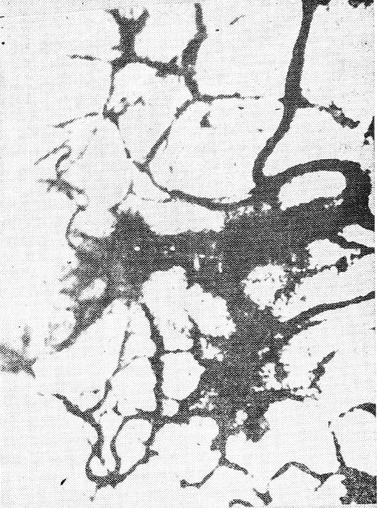 При осмотре сосудов конъюнктивы глазного яблока в 80% случаев отмечен выраженный периваскулярный отек, в 20 % — микрогеморрагии. У половины обследуемых женщин обнаружены зоны «запустевания» капилляров, бледность, «бедность» сосудистого фона, характерная «ячеистость», что связано с образованием артерио-венулярных анастомозов (рис. 9). Отношение артериол к венулам — 1/5, в 10% случаев — 1/7. У каждой пятой больной были аневризмы венул. Агрегация эритроцитов в тяжелых случаях наблюдалась в сосудах всех диаметров (в 30%), в венулах крупного диаметра, артериолах среднего и мелкого диаметра и капиллярах (в 20%).