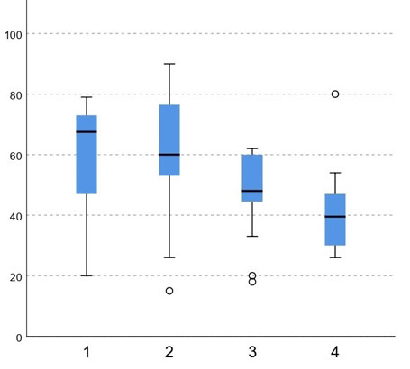 Рис. 2. Абсолютное количество Т-NK-киллеров (CD3+CD16+CD56+) (клетки/мкл) в кожном экссудате при атопическом дерматите (АтД): 1 — подростки с ограниченным АтД; 2 — подростки с распространённым АтД; 3 — взрослые с ограниченным АтД; 4 — взрослые с распространённым АтД