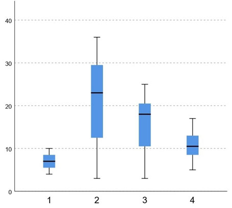 Рис. 3. Абсолютное количество естественных киллеров (NK) (CD3+CD16+CD56+) (клетки/мкл) в кожном экссудате при атопическом дерматите (АтД): 1 — подростки с ограниченным АтД; 2 — подростки с распространённым АтД; 3 — взрослые с ограниченным АтД; 4 — взрослые с распространённым АтД