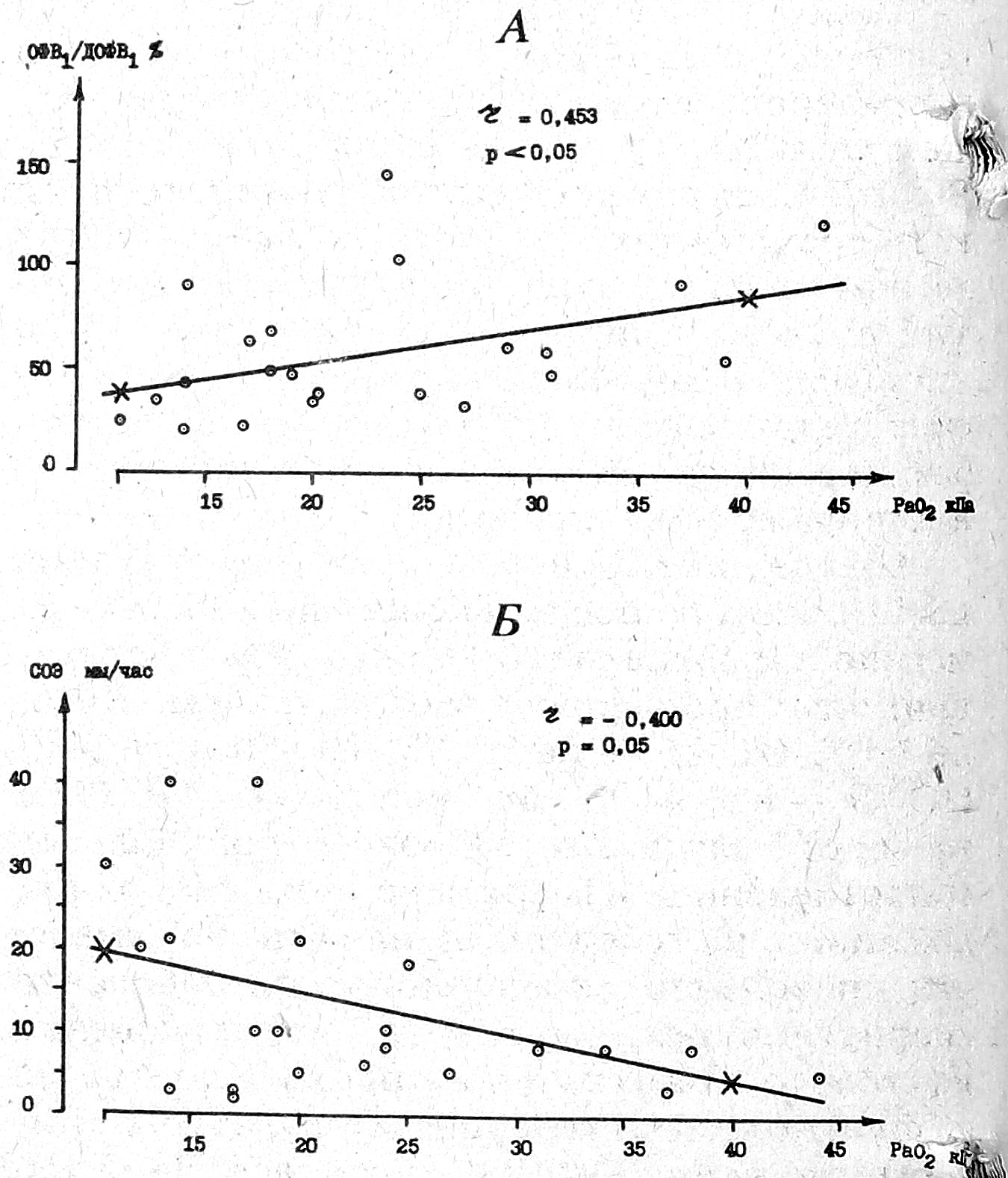 Рис. 1. Фактическое распределение значений объема форсированного выдоха на 1 с (А) и СОЭ (Б) при различных значениях РаО2 после оксигенации и прямые, отражающие линейную корреляцию между этими показателями (подробное описание в тексте).