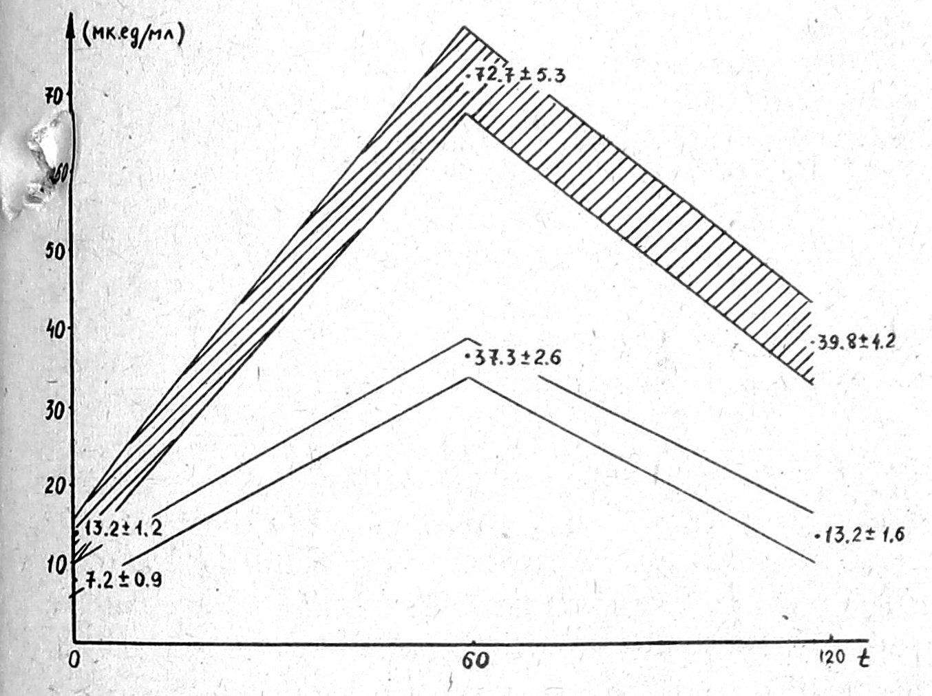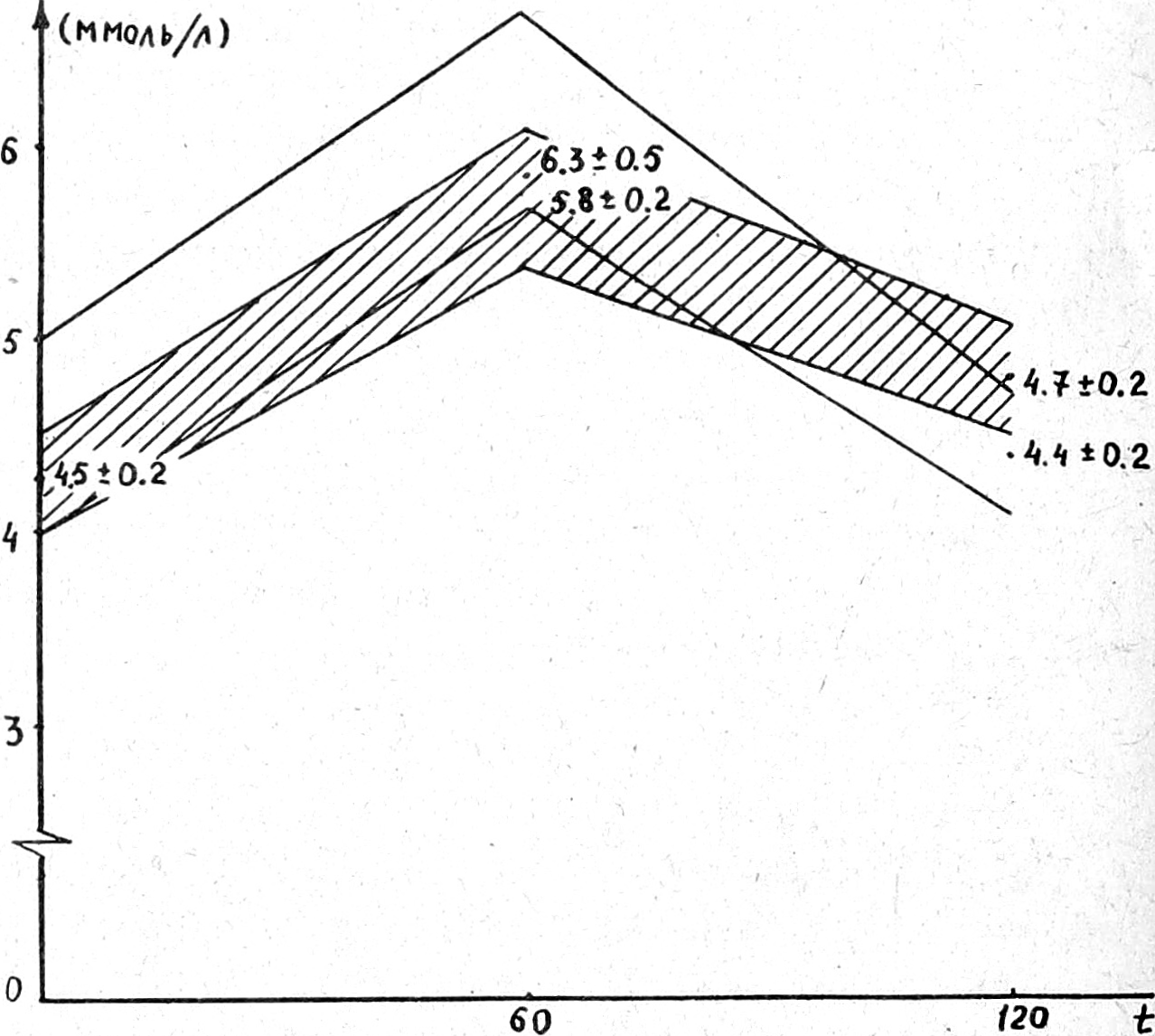 Показатели глюкозы крови у больных рассеянным склерозом колебались от 3,0 до 7,5 ммоль/л, в среднем от 4,26 до 0,19 ммоль/л (норма — 4,5±0,5; Р>0,5). Через 1 ч после приема глюкозы ее уровень повышался до 5,8±0,2 ммоль/л (норма — 6,3±0,5 ммоль/л; Р>0,5), к исходу второго часа снижался до 4,7±0,2 ммоль/л у больных и до 4,4±0,2 ммоль/л у здоровых (Р>0,5). У половины больных были выявлены различные, но не резкие извращения гликемических кривых. Торпидный и диабетический тип кривой имел место у 10 (18,9%) больных, гипогликемическая кривая — у 8 (15,1%), кривая с отставанием гипергликемии у одного (1,9%). Превышение уровня глюкозы через 2 ч у лиц с торпидной кривой составляло 6—8 ммоль/л. Высокий показатель натощак, обнаруженный у 6 больных, через 2 ч не нормализовался у 2; у 9 лиц первично нормальный уровень глюкозы сохранялся повышенным до окончания ГТТ (рис. 1).
