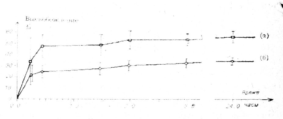 С целью биофармацевтической оценки выбранной композиции было проведено сопоставление динамики высвобождения димефосфона из концентрата лосьона и водного раствора методом равновесного диализа по Крувчинскому через подскорлуповую оболочку куриного яйца. Результаты исследования отражены на рисунке.