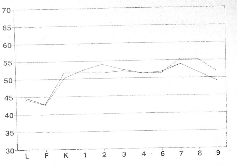Усредненный профиль СМОЛ обеих групп был в пределах нормативного разброса — 30—70 Т (рис. 1). При сравнении групп с использованием критерия Стьюдента оказалось, что профиль первой группы отличался лишь более высоким значением Т-баллов по 8-й шкале (t (42) =2,09; Р<0,05). Это объясняется, очевидно, тем, что большинство этих лиц являлись профессиональными математиками или инженерами-электронщиками, среди которых достаточно часто встречаются личности со склонностью к оригинальности суждений и интересов. Нельзя исключить и того, что на результаты сравнения могла повлиять описанная выше неоднородность групп.