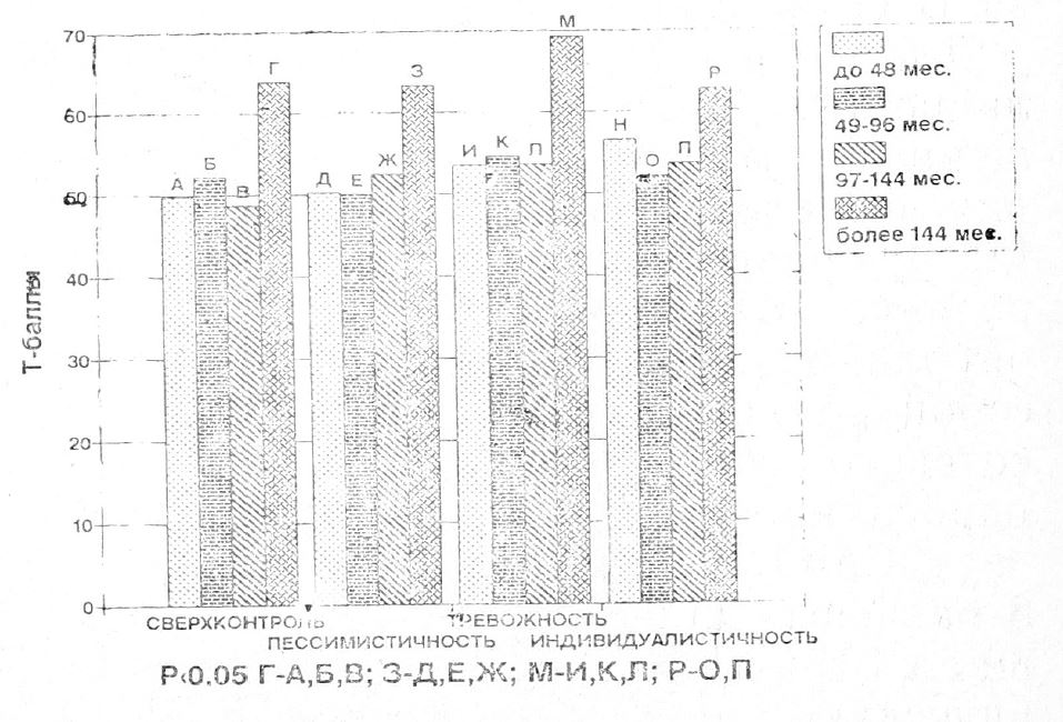 От стажа работы за ВДТ зависели уровни значений по 4 шкалам: 1-й (F(3,97)=6,2 (Р<0,001), 2-й (F(3,97)=4,6 (Р<0,01), 7-й (Н (3) =11,8 (Р<0,05) и 8-й (Н(3)=8,1 (Р<0,05), где F — критерий Фишера, а Н — критерий Крускала—Уоллиса. Кроме того, были проанализированы средние значения Т-баллов в стажевых группах и их различия между собой для каждой из упомянутых выше шкал (рис. 2). При стаже работы с ВДТ более 144 месяцев значения по этим шкалам были достоверно выше, чем в других стажевых группах (более 60 Т), что свидетельствовало об углублении при длительном профессиональном контакте с ВДТ таких индивидуально-личностных особенностей, как тенденция к повышенному самоконтролю, пессимистичность, тревожность и индивидуалистичность.
