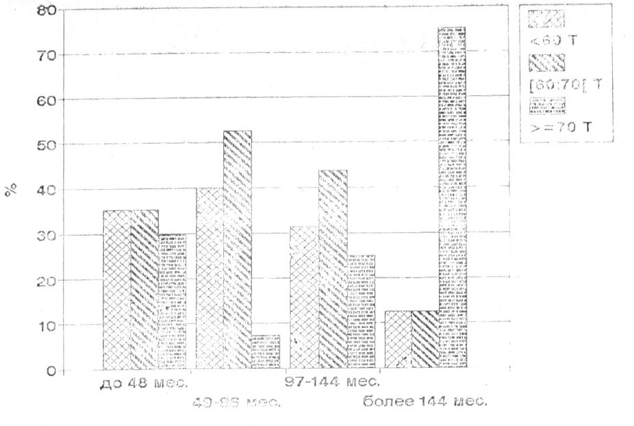 При оценке профиля СМОЛ как единого целого выделены 3 типа профилей: 1) значения Т-баллов по всем шкалам ниже 60; 2) значения Т-баллов хотя бы по одной из шкал больше или равны 60 и меньше 70; 3) значения Т-баллов хотя бы по одной из шкал больше или равны 70. Анализ таблиц сопряженности показал, что есть связь между стажем работы с ВДТ и типом профиля СМОЛ: X2(6)=18,54; Р<0,01 (рис. 3). При стаже работы с ВДТ более 144 месяцев у 75% лиц, входящих в эту группу (у 29,7%, 7,5% и 25% лиц в предыдущих стажевых группах), хотя бы одна из шкал профиля имела значение 70 и более Т-баллов. В основном 3-й тип профиля СМОЛ встречался у программистов, реже — у инструкторов-программистов (занимающихся не только программированием, но и преподавательской деятельностью) и никогда — у операторов ПЭВМ и ЭВМ. Следует, однако, упомянуть и тот факт, что среди лиц, отнесенных ко 2 и 3-й группам по типу профиля СМОЛ, было больше неудовлетворенных своей семейной жизнью. Но распределение по стажевым группам лиц со 2-м типом профиля СМОЛ было противоположным тому, что было обнаружено для 3-го типа: 35,1%, 52,5%, 43,7% и 12,5%. Это можно считать косвенным доказательством независимости типа профиля СМОЛ от степени удовлетворенности семейной жизнью.