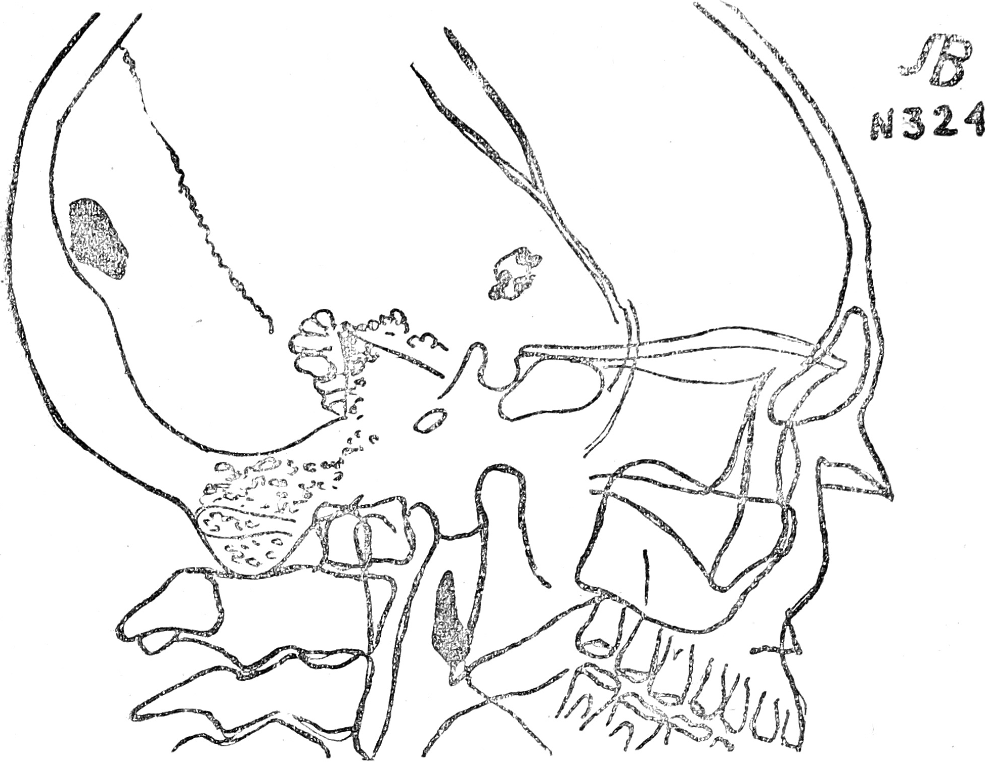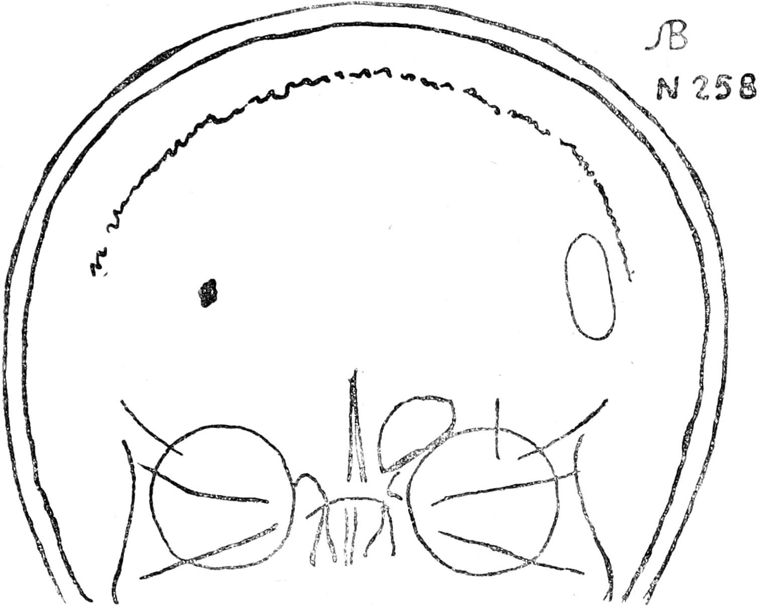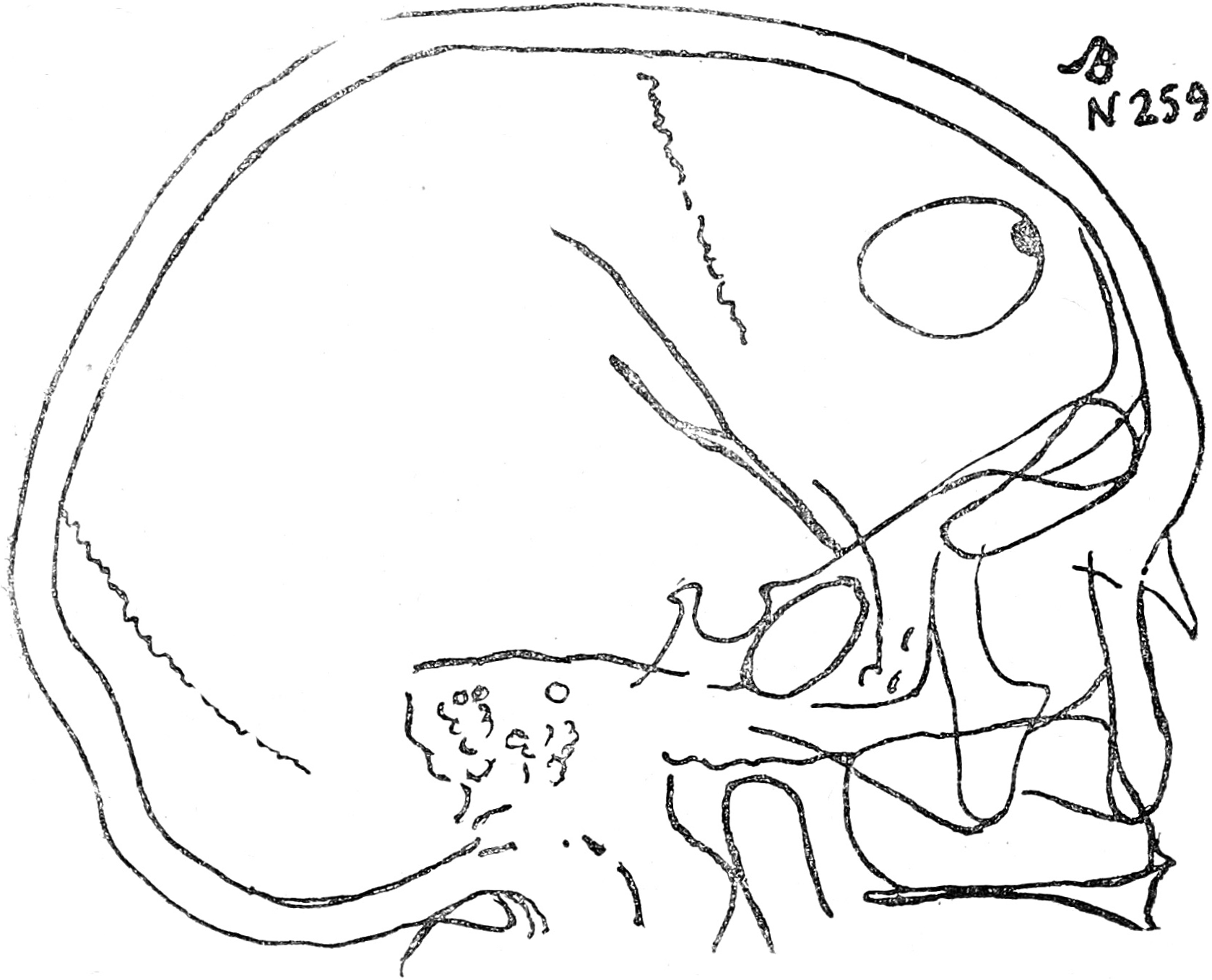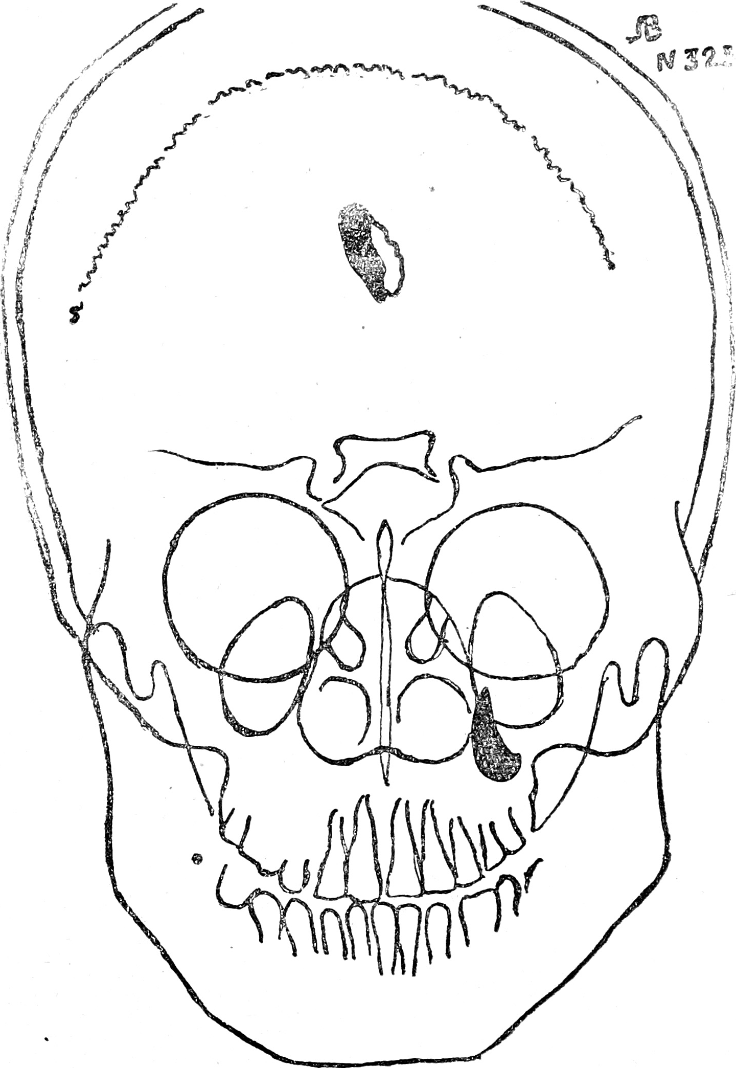У больного В., раненого в череп (1945 г.) на лобно-носовом снимке в проекции правого лобного бугра определяется металлическое инородное тело величиной, примерно, 0,5 X 0,6 см. На левой боковой поверхности чешуи лобной кости выявляется трепанационный дефект.