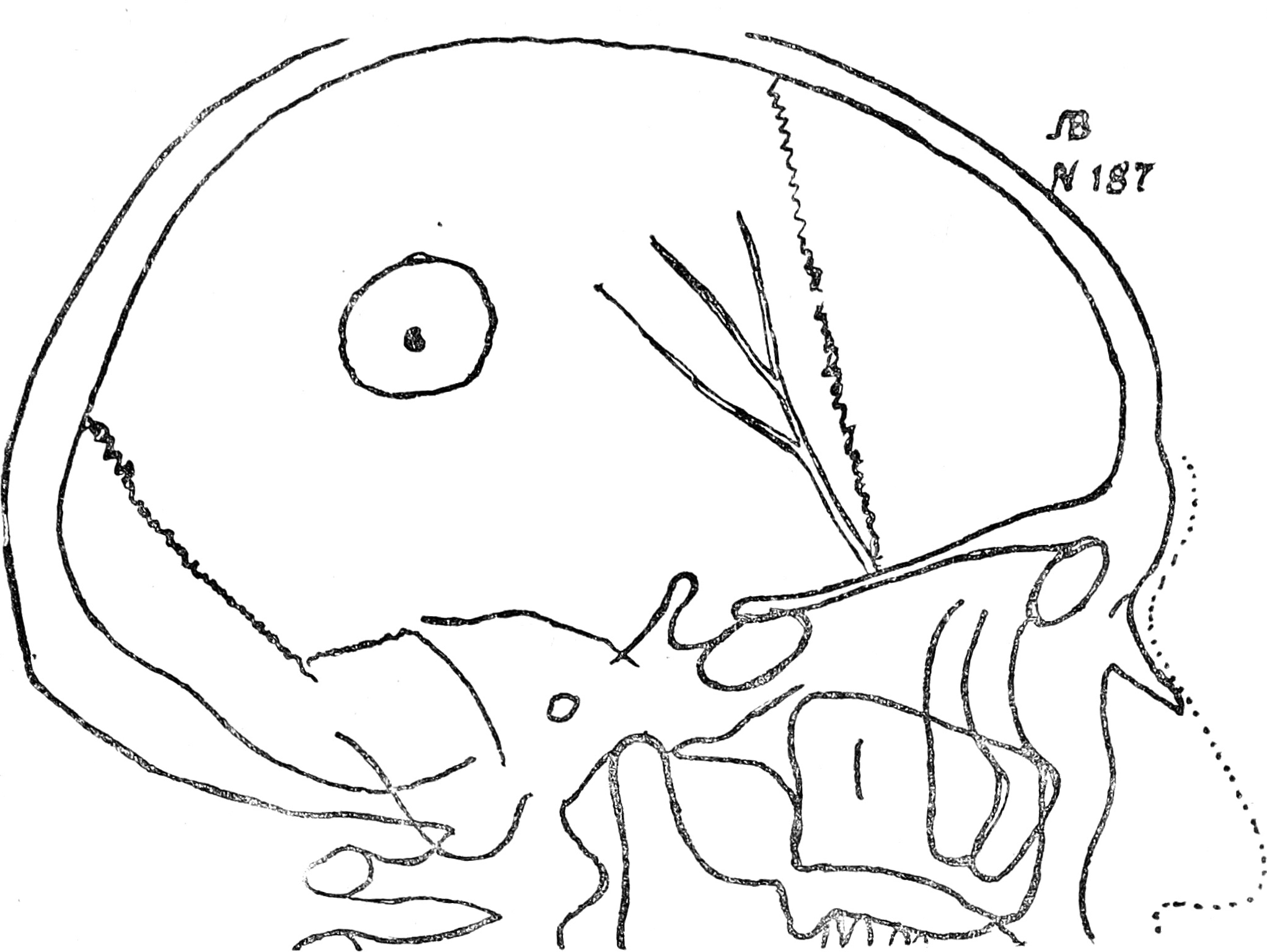 На схематическом рисунке с лобно-носовой рентгенограммы этого же больного инородное тело проицируется кнутри от внутренней пластинки левой боковой поверхности свода черепа. Уточняется также, что трепанационный дефект действительно находится на левой стороне черепа.