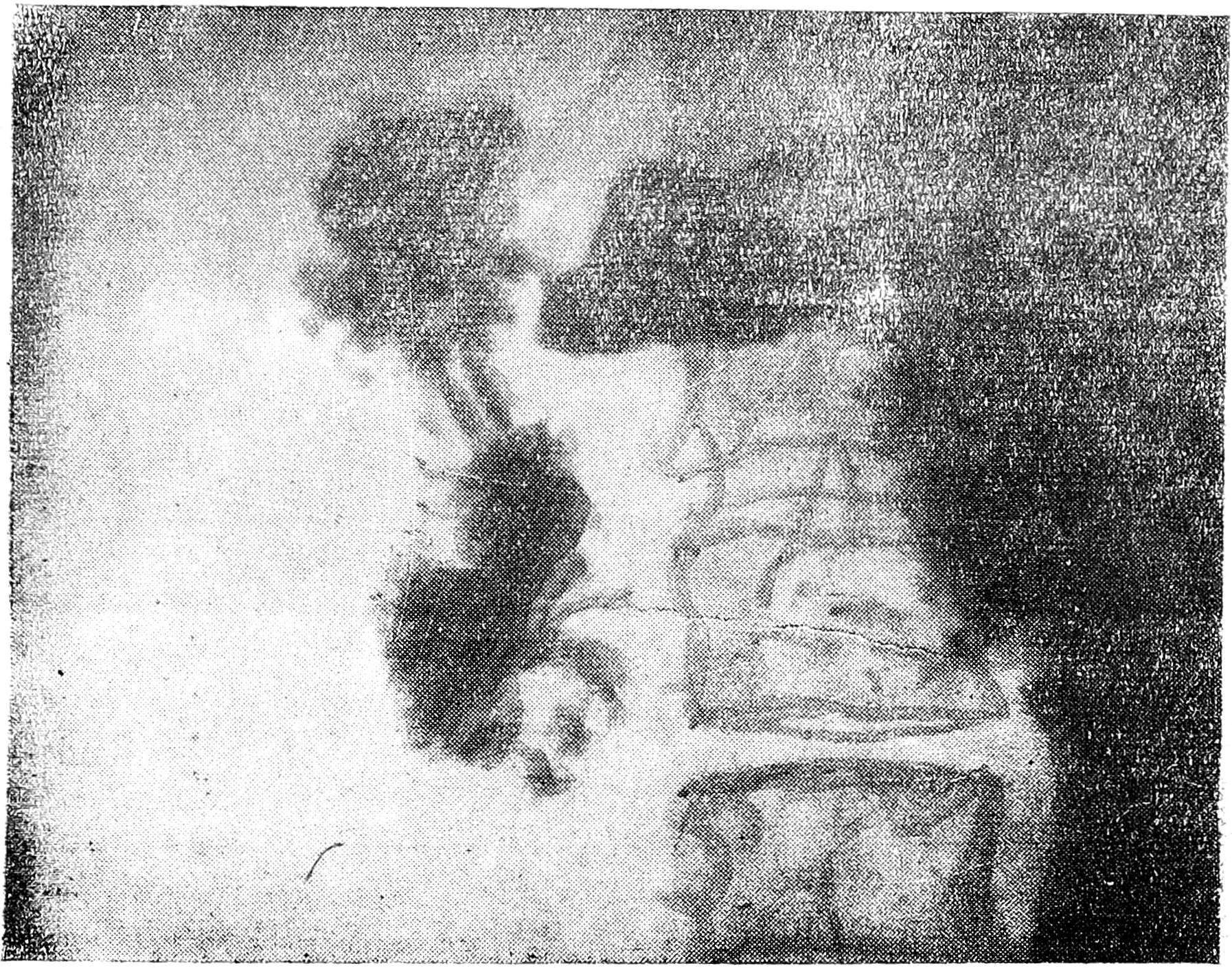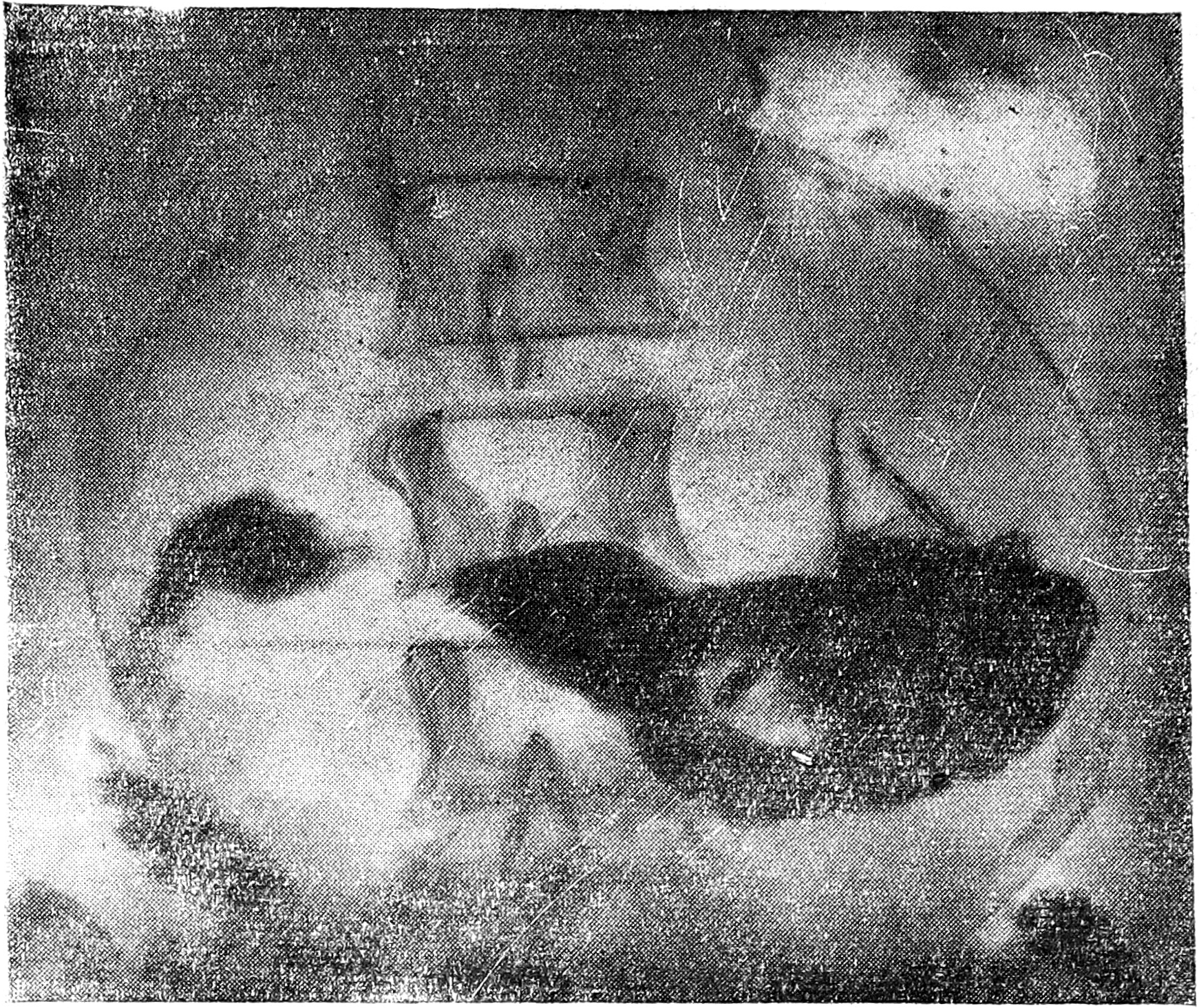 Больной К. Т. Бикташев, 55 лет (см. рис. 2), в течение ряда лет страдает анацидним гастритом, холециститом и гастрогенным колитом. За 8 месяцев до поступления в клинику рентгенологически обнаружен полипоз желудка и настоятельно рекомендована операция, от которой больной отказался, ввиду удовлетворительного самочувствия. За последние месяцы похудел, страдает постоянными ноющими болями в эпигастральной области, аппетит плохой, частая тошнота. Желудочный сок — ахилия. Реакция Грегерсена в кале положительна. Рентгенологически — изъязвленный крупный солитарный полип и мелкие полипозные разрастания в синусе и антральном отделе желудка. При операции — злокачественно перерожденные полипы.