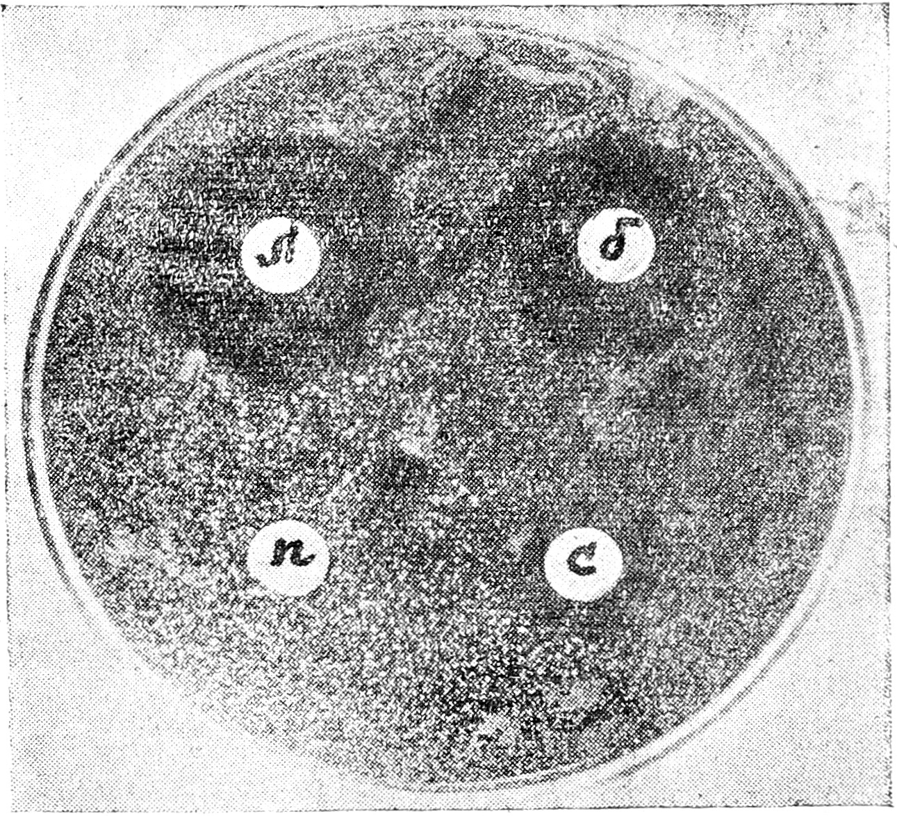 При определении чувствительности микроба к антибиотикам выявилось, что к пенициллину данный возбудитель абсолютно не чувствителен. Вокруг диска, пропитанного пенициллином, наблюдался сплошной рост палочки, наибольшая зона задержки роста оказалась у диска, пропитанного левомицитином (радиус — 14 мм), несколько меньшая — у диска с биомицином (радиус—12,5 мм) и еще меньше у диска со стрептомицином (радиус—10,5 мм) (См. рис. 1).