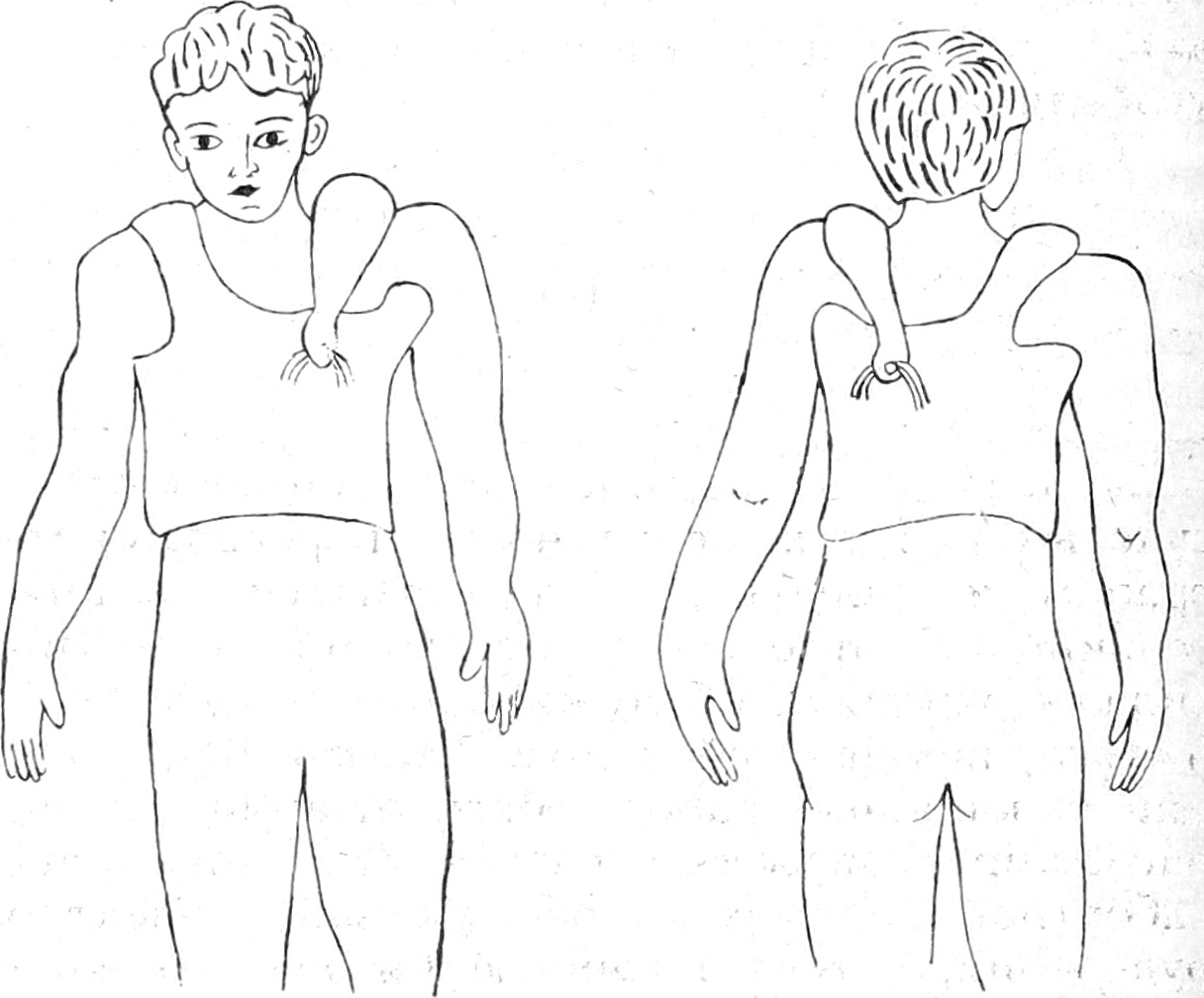 Больному накладывают гипсовый полукорсет, с поврежденной стороны в подмышечной области формируют гипсовый «овал», при этом плечевой пояс должен быть приподнят (см. рис.). С помощью резиновых трубок, фиксированных к передней и задней поверхности корсета, прикрепляют ватно-марлевые лямки (см. рис.), играющие основную роль в репозиции и удержании на месте ключицы. При необходимости их можно подтягивать.