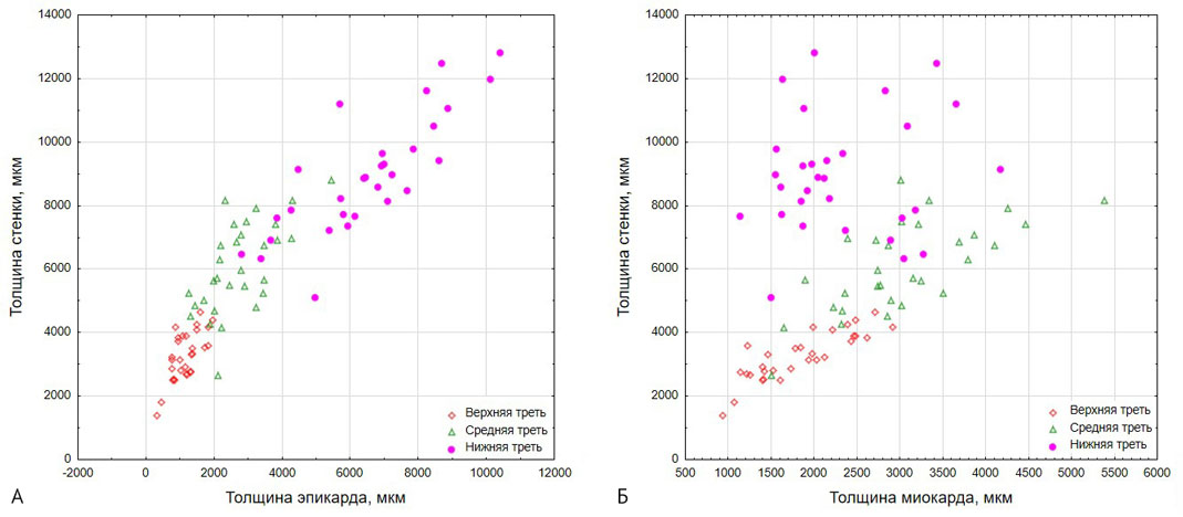Для верхней трети стенок была характерна явная зависимость толщины стенок от толщины миокарда (Rs=0,78), а в нижней трети стенок основной вклад в толщину вносил эпикард с подэпикардиальной клетчаткой (Rs=0,91; рис. 6).