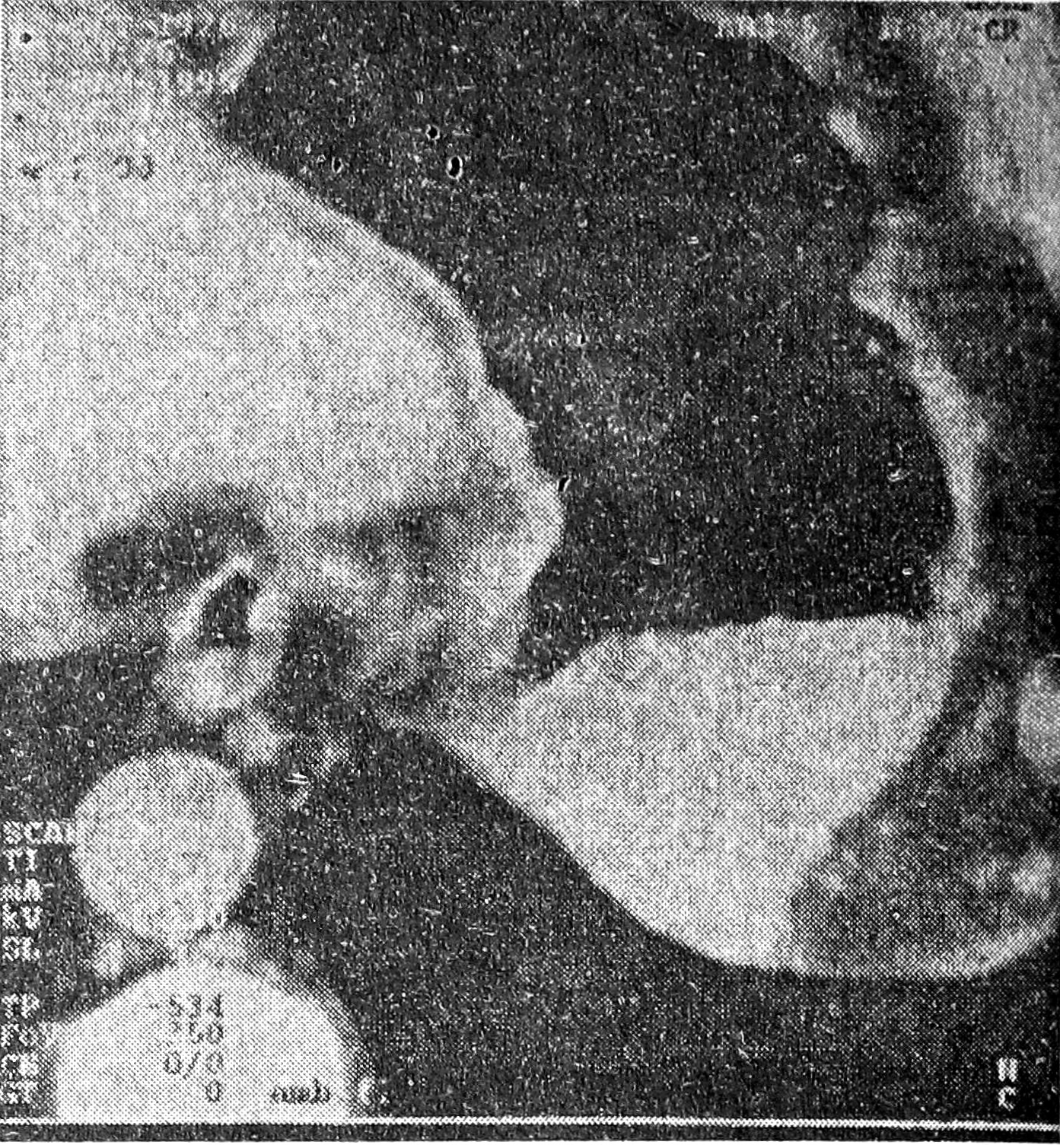 Благодаря анализу результатов компьютерно-томографических исследований желудка, нам удалось выделить основные дифференциально-диагностические признаки злокачественных и доброкачественных язв желудка. О злокачественном характере изъязвлений желудка судили по утолщению стенки желудка до 1,0 см и более на довольно большом протяжении, не соответствующему размерам язвенного дефекта. Язвенный кратер имел при этом вид плоского изъязвления с неровным, изломанным внутренним контуром, не выходящим за пределы стенки желудка; между этим утолщением и непораженной стенкой границы были нечеткими (рис.1).