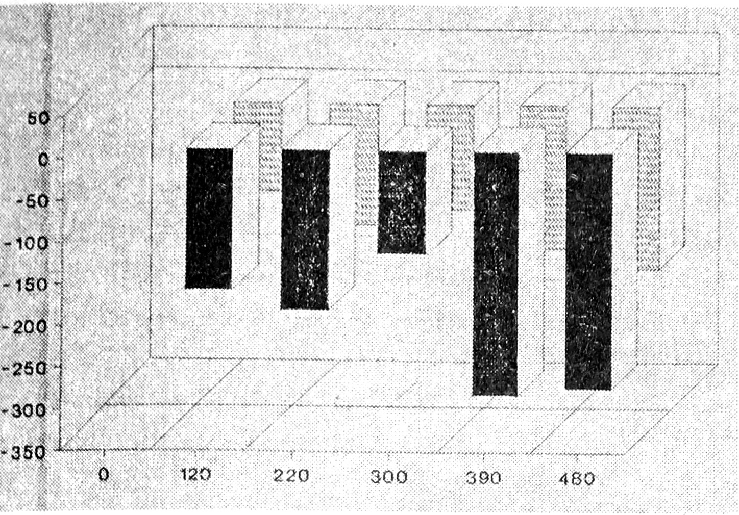 По оси ординат — снижение скорости переработки информации по сравнению с исходным уровнем (бит/с); по оси абсцисс — время рабочей смены (мин); темные столбики — герметизаторщицы, заштрихованные — электромонтажницы.