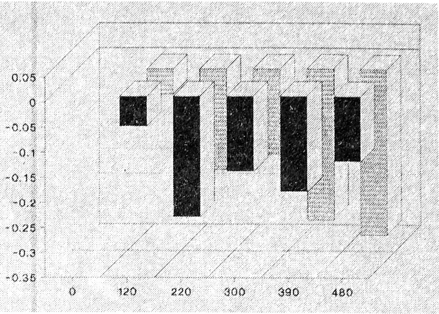 По оси ординат — изменение максимальной мышечной работоспособности по сравнению с исходным уровнем (Нс); по оси абсцисс — время рабочей смены (мин); темные столбики — герметизаторщицы, заштрихованные — электромонтажницы.