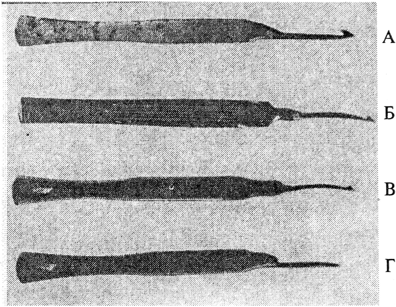 Рис. 1. Внешний вид флеботомов, изготовленных на основе скальпелей. А, Б, В — копьевидные, Г — пластинчатый.