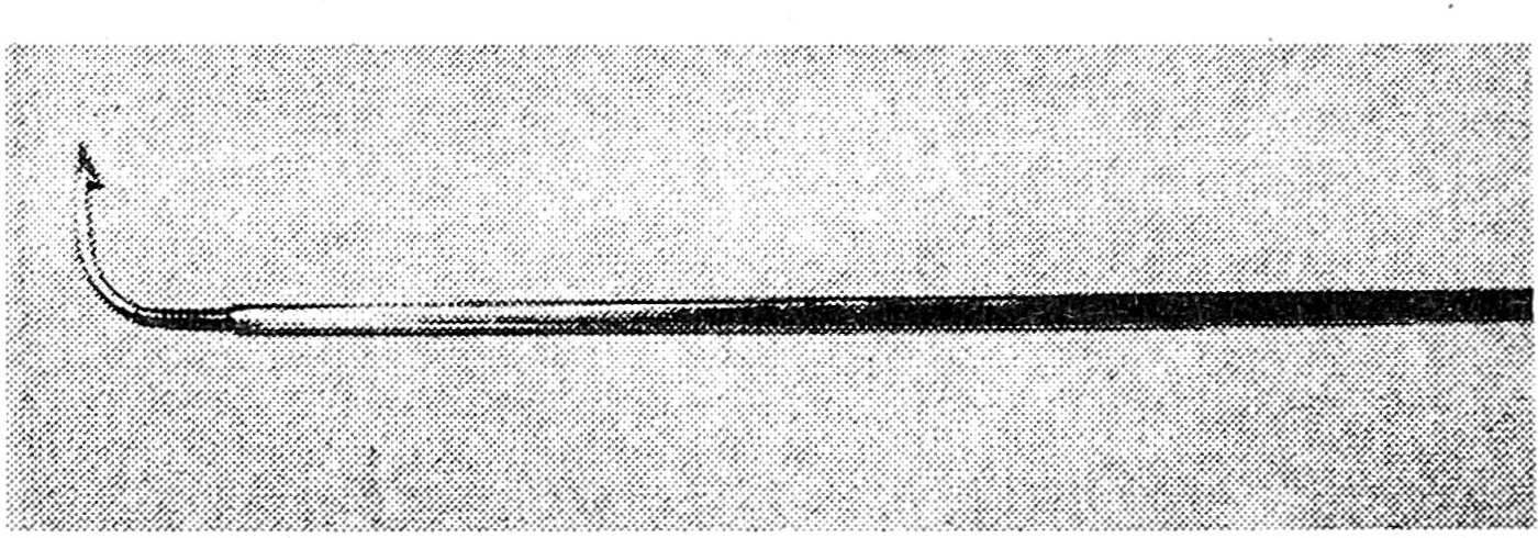 Второй вариант устройства представлен рабочей частью в виде узкого пластинчатого скальпеля с односторонней заточкой (рис. 1Г). Кроме того, нами применяется третий вариант флеботома — модифицированный однорогий копьевидный инструмент, изогнутый под прямым углом (рис. 2).