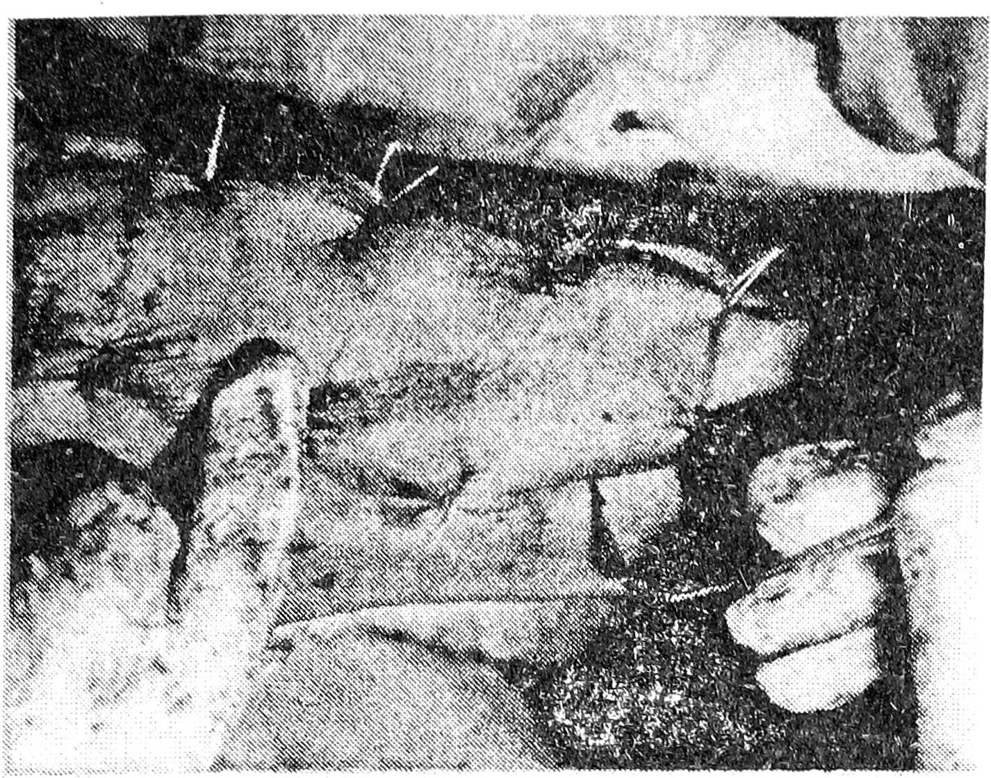Больного укладывают на спину и приподнимают ему оперируемую конечность над операционным столом под углом 25—30°. После завершения операции Троянова—Тренделенбурга и Бебкокка на бедре и голени производят чрескожное поперечное узловое прошивание коллатеральных размеченных вен тонкой синтетической нитью через каждые 25—30 мм. Таким образом осуществляют превентивный гемостаз. Затем начиная с задней поверхности бедра и голени между лигатурами делают прокол кожи флеботомом на расстоянии 10—15 мм от проекции вены (рис. 3). Рабочую часть устройства продвигают под вену так, чтобы вершина острого крючка была заведена за сосуд. При этом последний оказывается в пространстве между режущей кромкой крючка и стержнем инструмента.