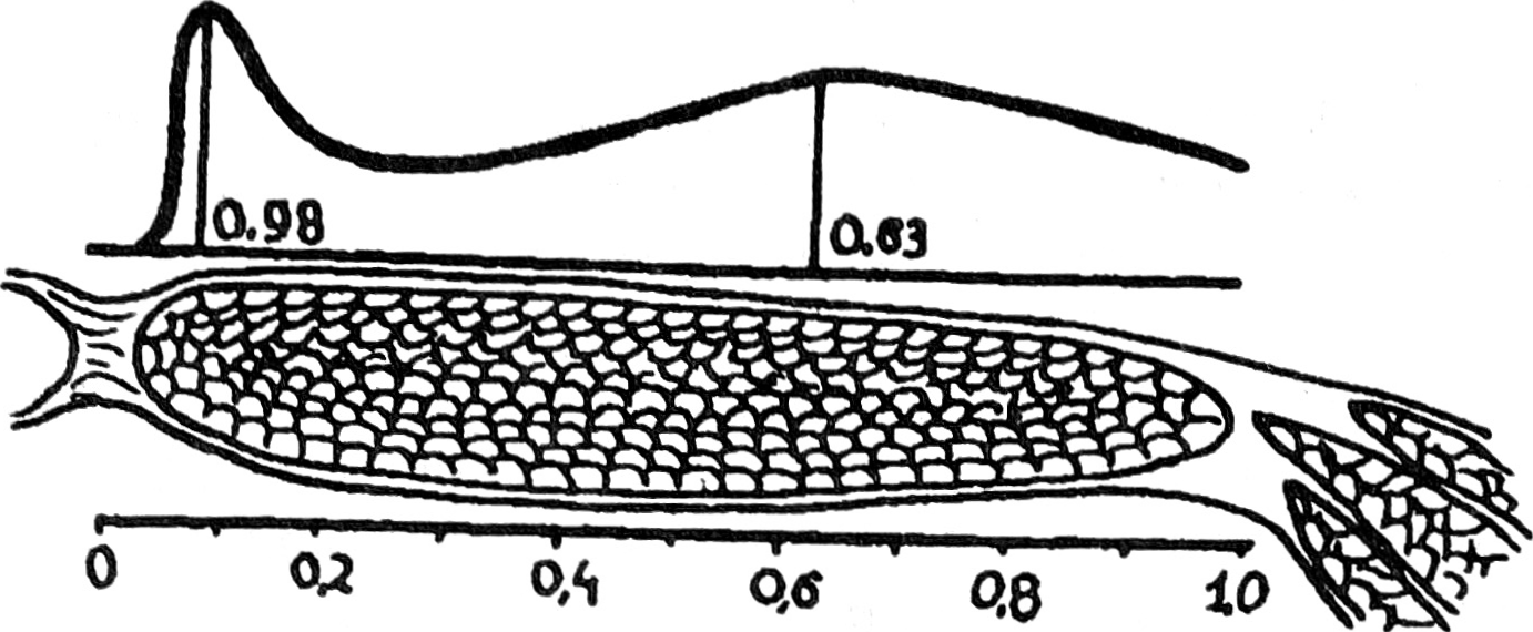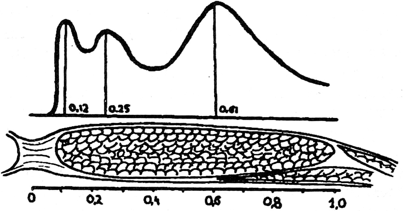 Было обнаружено, что кровеносные сосуды, перфорирующие апоневроз передней стенки влагалища прямой мышцы живота, расположены несколькими параллельными и нечетко выраженными продольными рядами. Измеряли расстояние от средней линии до перфорирующих сосудов по перпендикуляру. Результаты математически обработаны методом табулирования по аргументу и отыскания экстремумов полученных функций. При этом были определены достоверные (Р=0,05) границы зон наибольшей плотности перфорантных сосудов. Математическая обработка подтвердила первоначальное предположение о том, что перфорирующие сосуды расположены рядами. В эпигастральной и мезогастральной областях таких рядов оказалось три (рис. 1a, 1б), а в гипогастральной области — два (рис. 1 в), причем количество сосудов в ней оказалось в 2,5—3 раза меньше, чем в эпигастральной и мезогастральной областях.