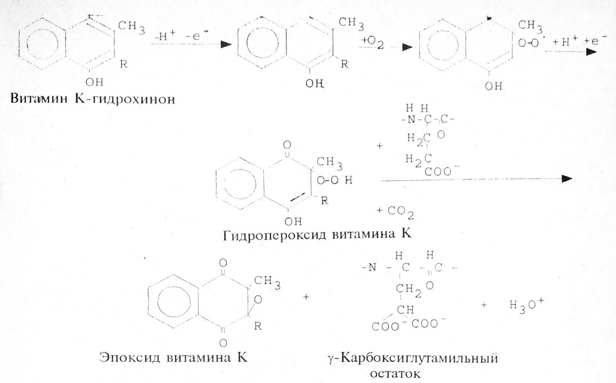 После открытия витамина К прошло около 40 лет, прежде чем стал известен этап белкового синтеза, в котором он принимает участие. Витамин К в гидрохинонной форме выполняет роль кофермента карбоксилазы, осуществляющей карбоксилирование обычно рядом расположенных остатков глутаминовой кислоты в белках в остатки гамма-карбоксиглутаминовой кислоты.