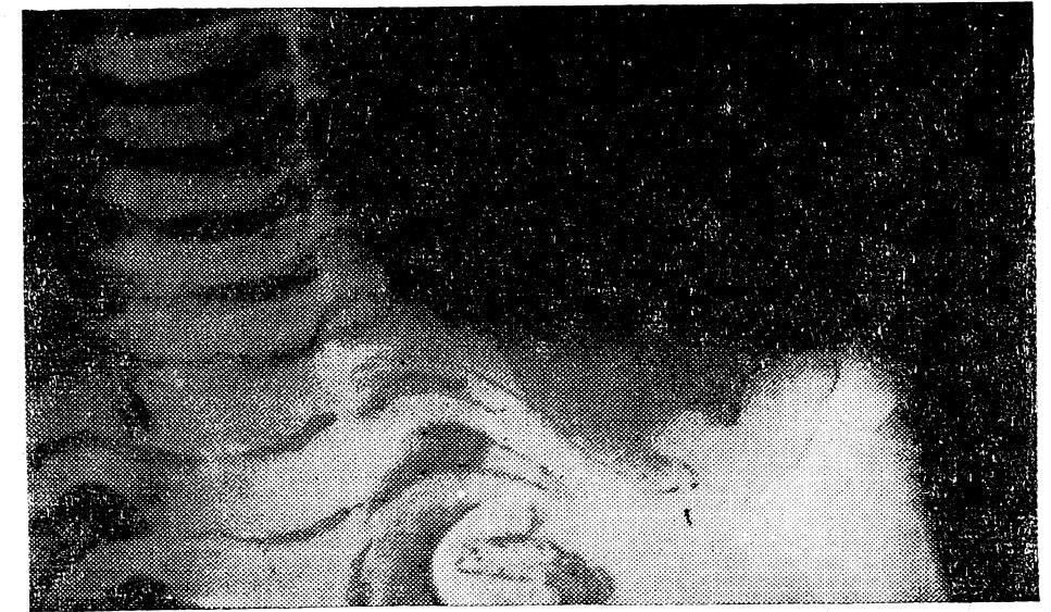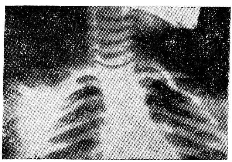 На рис. 3 представлена рентгенограмма плечевого пояса М. от 12/VІІ 1967 г. Правая ключица на отдельных участках на 1,5—2 мм толще левой, S-образный изгиб несколько круче. Расстояния от точки пересечения продолжения оси обеих ключиц с продольной осью позвоночника до акромиального конца ключицы, верхушки акромиального и клювовидного отростков, а также контура латерального квадранта головки плечевой кости с обеих сторон равны, хотя на первый взгляд рентгенограмма производит несколько иное впечатление.