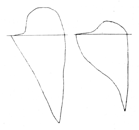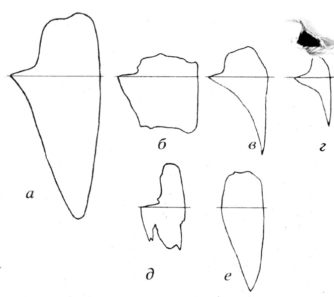 Рестриктивный вариант недостаточности внешнего дыхания проявлялся в основном у больных острой пневмонией с резко выраженным болевым компонентом или у перенесших в анамнезе те или иные операции на легких. Кривые характеризовались сжатостью горизонтальных размеров. Динамика показателей у таких больных была следующей: в процессе терапии отмечалось их уменьшение от 16 до 6% (рис. 1е). На рис. 2 изображены два варианта КПО у здоровых.