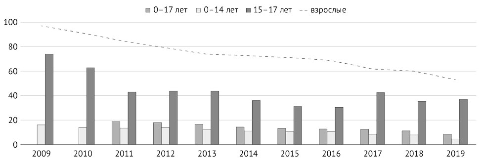 Российская Федерация присоединилась к резолюции 67-й Всемирной ассамблеи Всемирной организации здравоохранения (ВОЗ) [1], в которой поставлена задача к 2035 г. снизить смертность от туберкулёза на 95% и заболеваемость туберкулёзом на 90% по сравнению с 2015 г. [2]. Данные ВОЗ [3] и отечественной статистики показывают, что эпидемическая ситуация по туберкулёзу в России в последние годы улучшается, о чём свидетельствует динамика основных показателей: снижаются заболеваемость, распространённость и смертность от туберкулёза среди взрослых [4–6] и детей [4, 7, 8]. В Тюменской области заболеваемость туберкулёзом детей от 0 до 17 лет к 2019 г. впервые стала ниже, чем в России (РФ — 9,0 на 100 тыс. детского населения) [4, 9]. Динамика показателей заболеваемости среди детей, подростков и взрослых представлена на рис. 1.