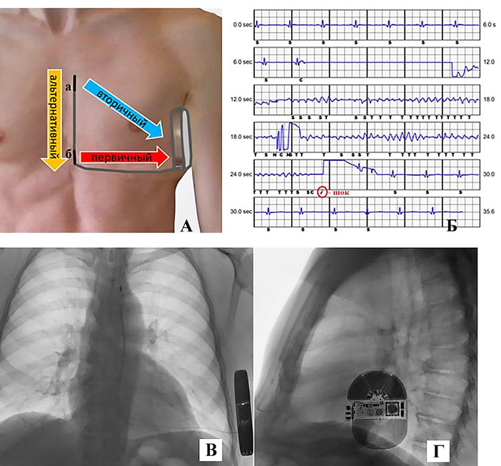 Рис. 1. А. Позиционирование системы подкожного имплантируемого кардиовертера-дефибриллятора. Направления векторов восприятия желудочковой аритмии. Первичный: от проксимального полюса электрода до корпуса. Вторичный: от дистального полюса электрода до корпуса. Альтернативный: от дистального до проксимального полюса электрода; a — дистальный полюс электрода; б — проксимальный полюс электрода. Б. Дефибрилляционный тест. Индукция и эффективное купирование фибрилляции желудочков шоковым разрядом. В. Рентгеноскопия системы подкожного имплантируемого кардиовертера-дефибриллятора. Прямая проекция. Г. Левая проекция.