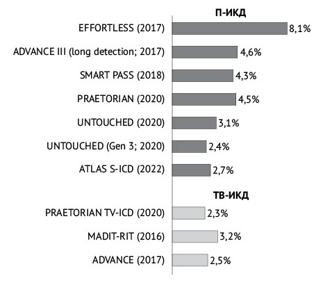 Рис. 2. Годовая частота немотивированных шоков кардиовертеров-дефибрилляторов по данным крупных исследований. П-ИКД — подкожный имплантируемый кардиовертер-дефибриллятор; ТВ-ИКД — трансвенозный имплантируемый кардиовертер-дефибриллятор