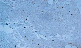 Рис. 3. Низкая экспрессия рецепторов андрогенов в ядрах опухолевых клеток больных люминального подтипа В. Увеличение ×20